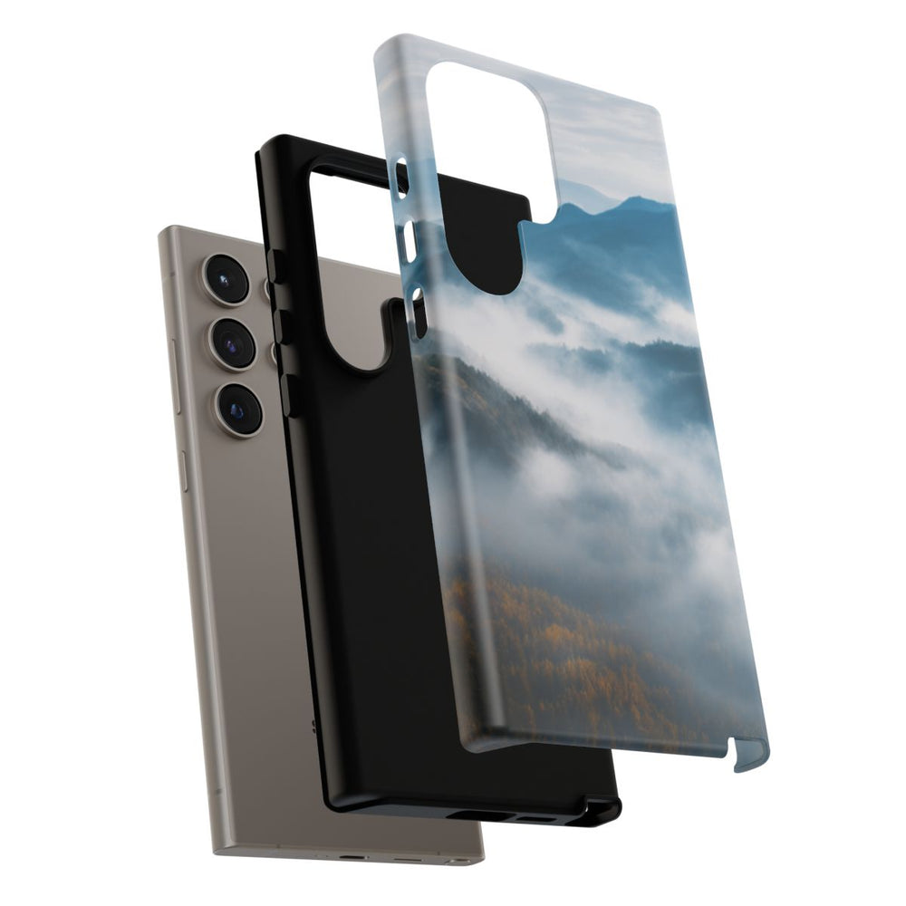 Dit hoesje toont een indrukwekkend uitzicht van bovenaf op bergtoppen die deels zijn gehuld in mist en lage wolken. Het landschap bestaat uit verschillende lagen bergen die vervagen aan de horizon onder een bewolkte hemel. De mist zorgt voor een zachte, dromerige sfeer en vloeit samen met de blauwe tinten van de bergen en de lucht. De afbeelding is gedrukt op een mat hoesje met een stevige polycarbonaat buitenkant en een TPU binnenzijde, wat zorgt voor dubbele bescherming en geschikt is voor draadloos opladen. De koele blauwtinten bepalen het kleurgebruik van het ontwerp.