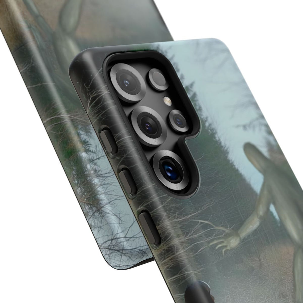 Dit hoesje toont een duister boslandschap met hoge bomen en een bladerdek op de grond. Op het pad loopt een persoon in donkere kleding, tegenover een lange, mensachtige figuur met uitgestrekte ledematen en een doorschijnend, spookachtig uiterlijk. De achtergrond bestaat uit dichte bomen en een mistige sfeer, wat zorgt voor een mysterieuze en spannende uitstraling. Het matte, stevige hoesje is gemaakt van duurzame materialen en ondersteunt draadloos opladen.
