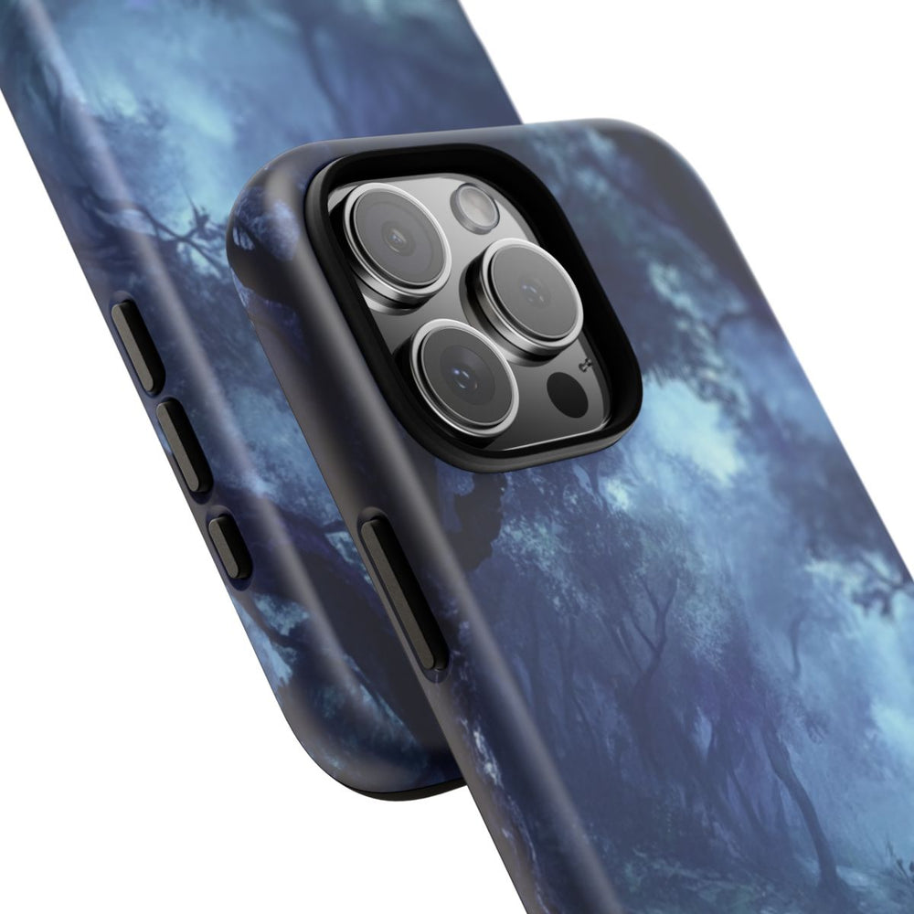 Dit ontwerp toont een mistige bosweg omringd door donkere, kronkelende bomen met dicht gebladerte. De afbeelding straalt een gotische en mysterieuze sfeer uit, waarbij diepe blauwe en paarse tinten overheersen. Het pad slingert door het bos en geeft een gevoel van diepte en afzondering. Het hoesje bestaat uit twee lagen van polycarbonaat en TPU, heeft een matte afwerking en biedt uitstekende bescherming en duurzaamheid, ook bij buitengebruik. Geschikt voor draadloos opladen.