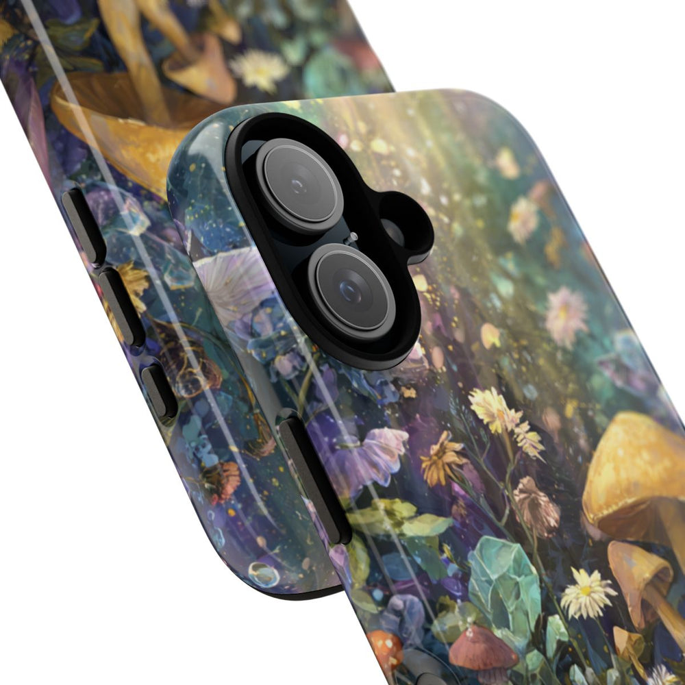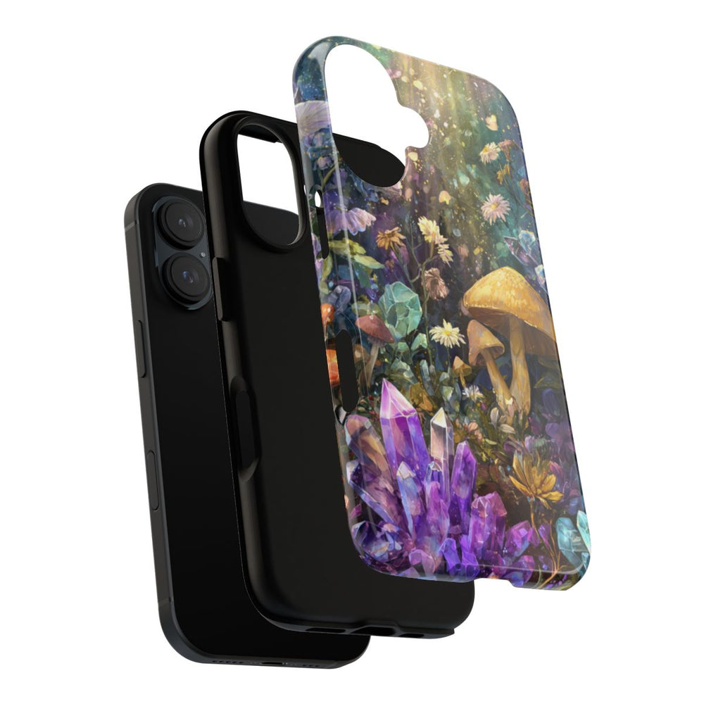 Dit kleurrijke telefoonhoesje toont een betoverend natuurtafereel met opvallende paddenstoelen, verschillende bloemen en grote kristalclusters. Zachte zonnestralen verlichten de scène van bovenaf en zorgen voor een magische sfeer. Paarse, gele en oranje paddenstoelen worden omringd door bloemen in tinten roze, geel en wit. De kristallen vallen op door hun paarse en blauwe kleuren en geven het geheel een sprankelend effect. De afbeelding is gedrukt op een glanzend, stevig hoesje van duurzaam polycarbonaat met een TPU-voering. Het hoesje ondersteunt draadloos opladen en is bestand tegen diverse weersomstandigheden.