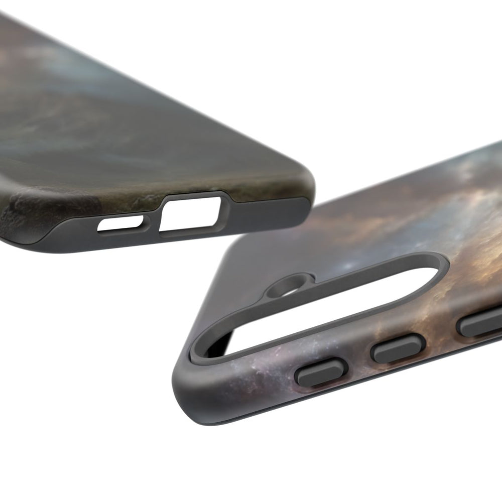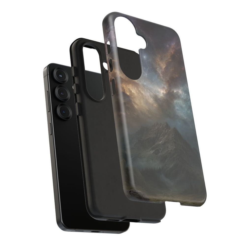 Dit ontwerp toont een indrukwekkende bergtop, omringd door dichtbegroeid bos en rotsachtig terrein onder een betoverende nachtelijke hemel. De lucht is gevuld met draaiende wolken en kosmische lichteffecten in tinten donkerblauw, grijs en warme amberaccenten. Deze scène roept een mysterieuze en indrukwekkende sfeer op. Het telefoonhoesje heeft een dubbele beschermlaag met een matte afwerking en is gemaakt van polycarbonaat en TPU. Het biedt uitstekende bescherming en is geschikt voor draadloos opladen.