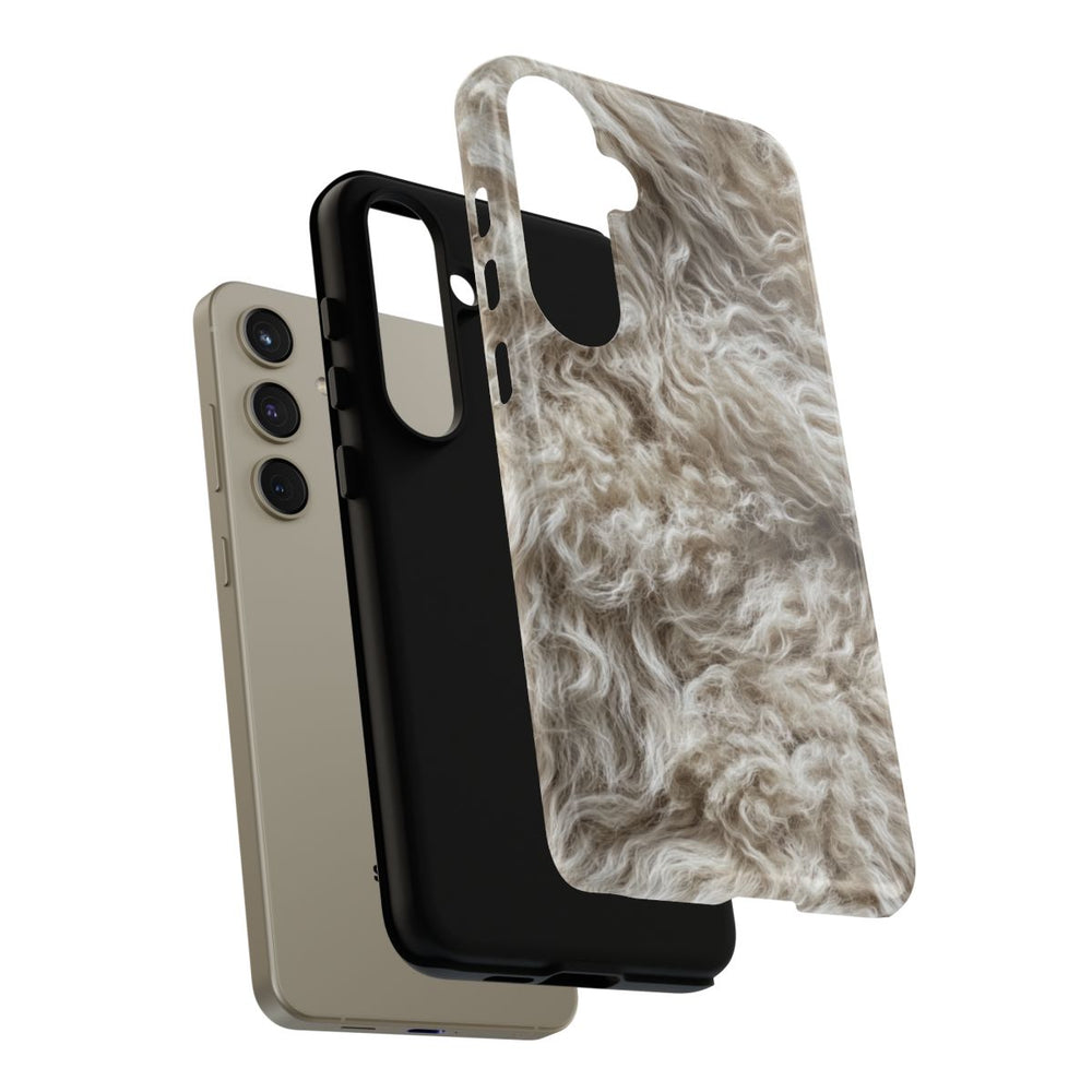 Dit ontwerp toont een close-up van natuurlijke krullende schapenvacht met een zachte, pluizige textuur. De afbeelding laat de fijne krullen en golven van de wolvezels zien in tinten beige en gebroken wit. Het patroon oogt organisch en tastbaar, en benadrukt de natuurlijke uitstraling van het materiaal. Dit glanzende, stevige hoesje is vervaardigd met een duurzame dubbele laag: een polycarbonaat buitenkant en een TPU binnenzijde. Zo biedt het extra bescherming en is het geschikt voor draadloos opladen.