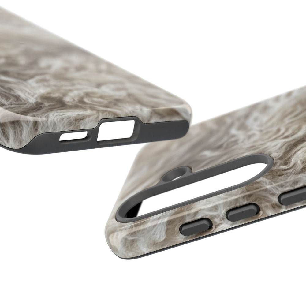 Dit ontwerp toont een close-up van natuurlijke krullende schapenvacht met een zachte, pluizige textuur. De afbeelding laat de fijne krullen en golven van de wolvezels zien in tinten beige en gebroken wit. Het patroon oogt organisch en tastbaar, en benadrukt de natuurlijke uitstraling van het materiaal. Dit glanzende, stevige hoesje is vervaardigd met een duurzame dubbele laag: een polycarbonaat buitenkant en een TPU binnenzijde. Zo biedt het extra bescherming en is het geschikt voor draadloos opladen.