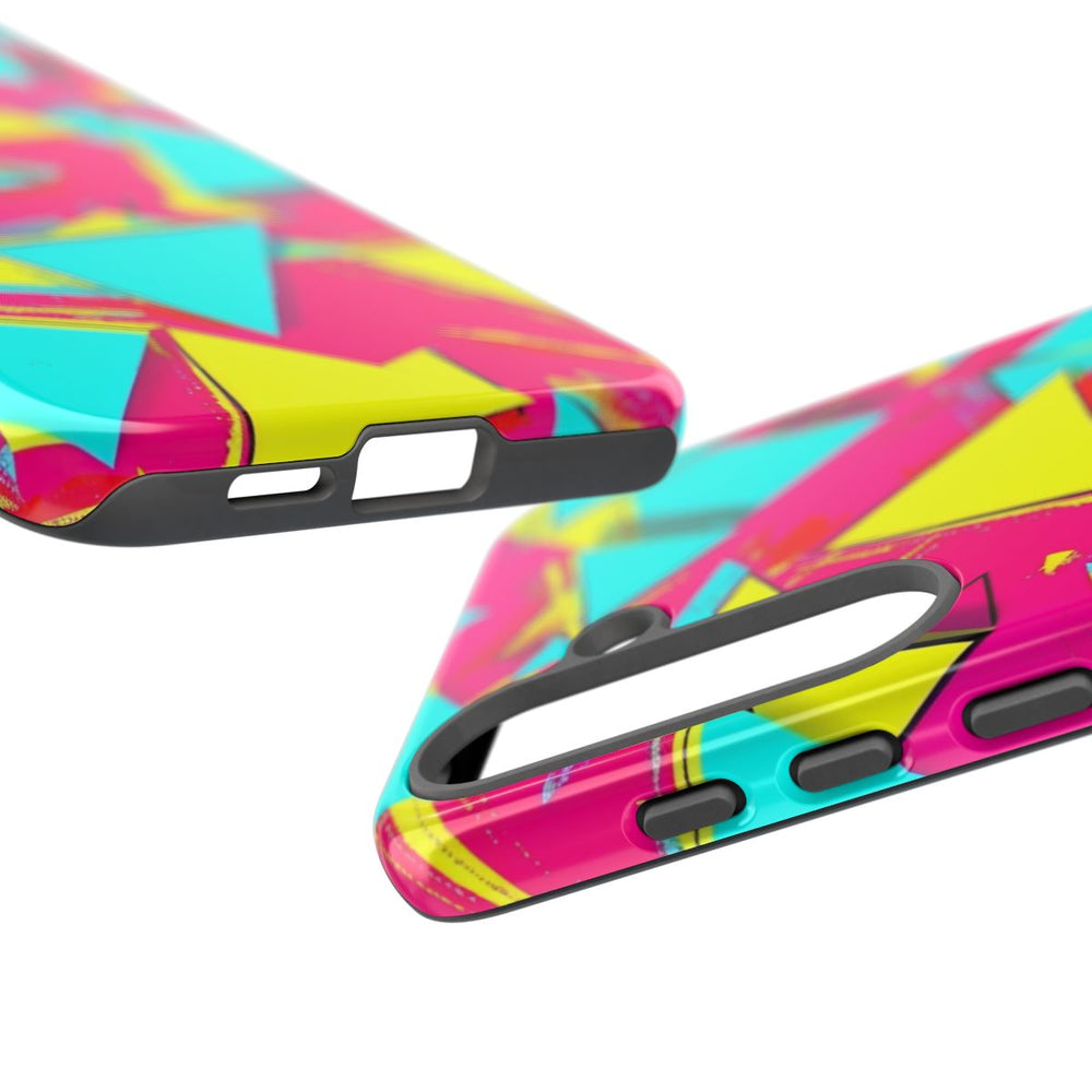 Dit telefoonhoesje heeft een opvallend abstract patroon van driehoeken in verschillende groottes en richtingen. De achtergrond is fel neonroze, terwijl de driehoeken vooral in neon cyaan en neon geel zijn uitgevoerd. Sommige driehoeken hebben dunne zwarte omlijningen, wat extra diepte aan het ontwerp geeft. Het patroon oogt dynamisch en levendig, met verspreide penseelstreken in geel en rood die het energieke karakter versterken. Dit glanzende, stevige hoesje heeft een dubbele laag voor extra bescherming en is geschikt voor draadloos opladen.