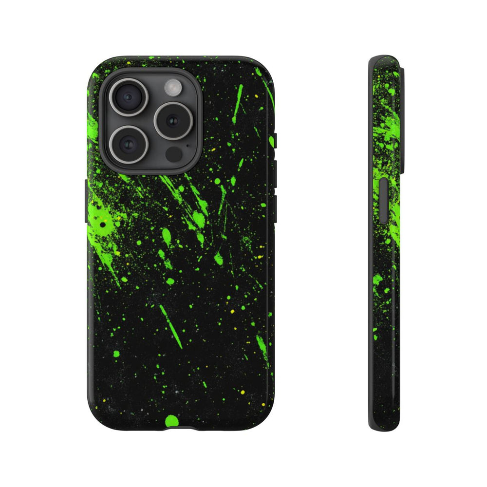 Dit telefoonhoesje heeft een zwarte achtergrond met opvallende neon groene verfspetters en kleine gele stipjes die willekeurig over het oppervlak zijn verspreid. De spetters verschillen in grootte en vorm, wat zorgt voor een abstract en energiek patroon. Het hoesje heeft een glanzende afwerking en is extra stevig dankzij de combinatie van een polycarbonaat buitenkant en een TPU binnenlaag. Zo krijgt je telefoon een dubbele beschermlaag. Dit hoesje ondersteunt draadloos opladen en is bestand tegen weersinvloeden, waardoor het zijn uitstraling langdurig behoudt.