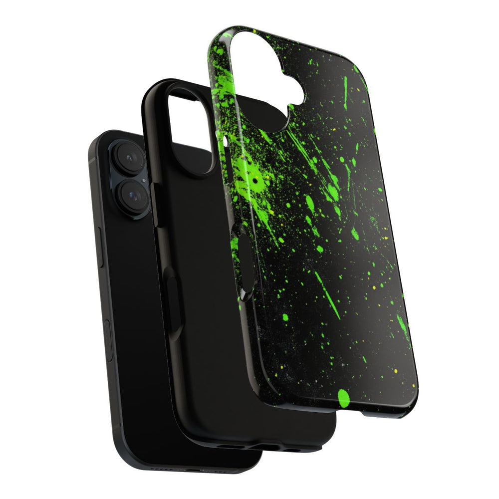 Dit telefoonhoesje heeft een zwarte achtergrond met opvallende neon groene verfspetters en kleine gele stipjes die willekeurig over het oppervlak zijn verspreid. De spetters verschillen in grootte en vorm, wat zorgt voor een abstract en energiek patroon. Het hoesje heeft een glanzende afwerking en is extra stevig dankzij de combinatie van een polycarbonaat buitenkant en een TPU binnenlaag. Zo krijgt je telefoon een dubbele beschermlaag. Dit hoesje ondersteunt draadloos opladen en is bestand tegen weersinvloeden, waardoor het zijn uitstraling langdurig behoudt.