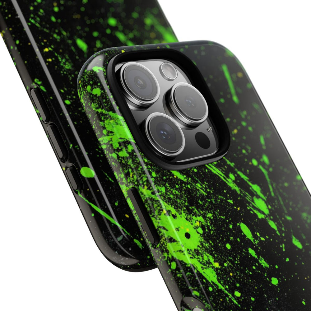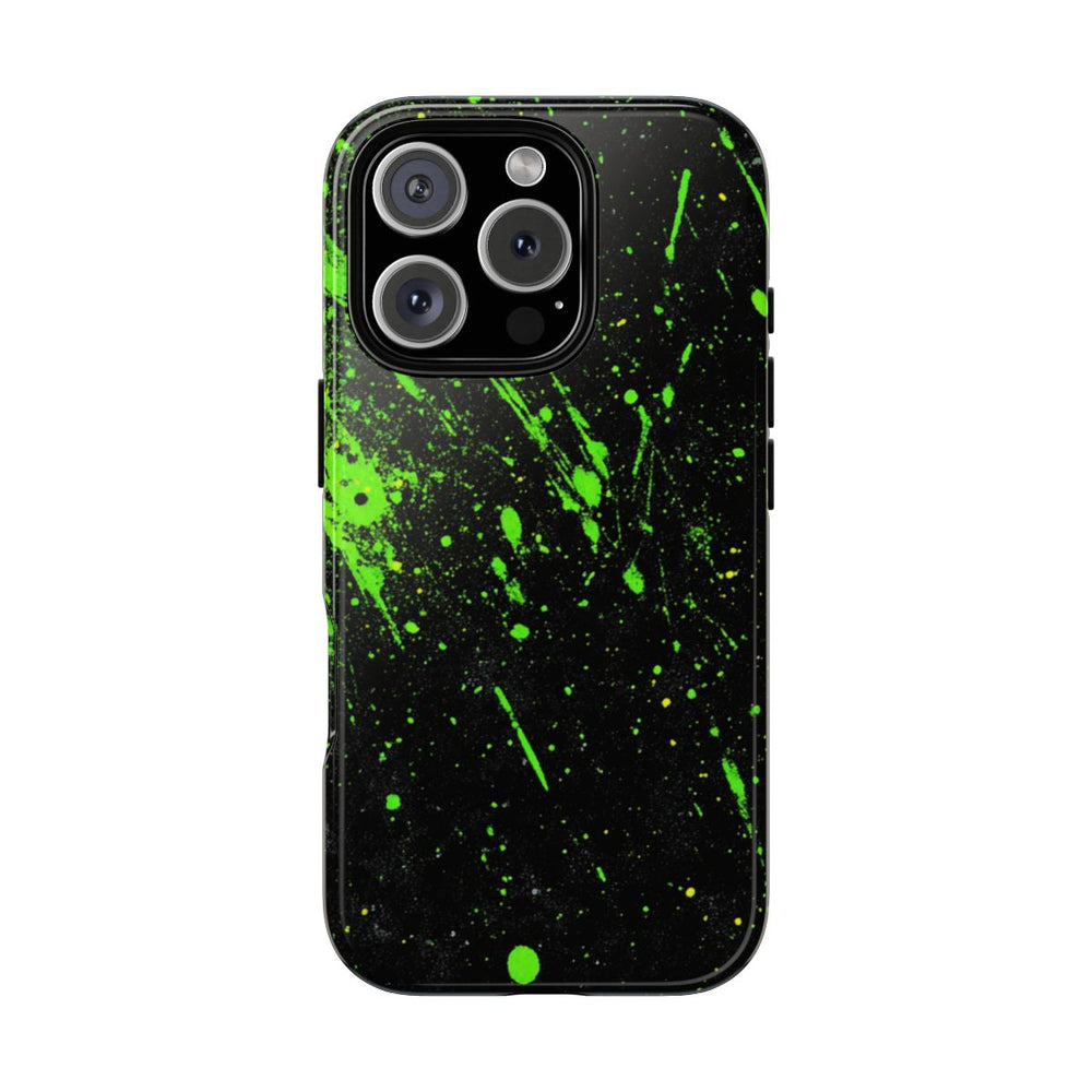 Dit telefoonhoesje heeft een zwarte achtergrond met opvallende neon groene verfspetters en kleine gele stipjes die willekeurig over het oppervlak zijn verspreid. De spetters verschillen in grootte en vorm, wat zorgt voor een abstract en energiek patroon. Het hoesje heeft een glanzende afwerking en is extra stevig dankzij de combinatie van een polycarbonaat buitenkant en een TPU binnenlaag. Zo krijgt je telefoon een dubbele beschermlaag. Dit hoesje ondersteunt draadloos opladen en is bestand tegen weersinvloeden, waardoor het zijn uitstraling langdurig behoudt.