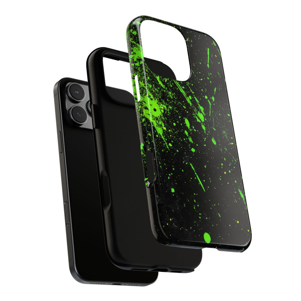 Dit telefoonhoesje heeft een zwarte achtergrond met opvallende neon groene verfspetters en kleine gele stipjes die willekeurig over het oppervlak zijn verspreid. De spetters verschillen in grootte en vorm, wat zorgt voor een abstract en energiek patroon. Het hoesje heeft een glanzende afwerking en is extra stevig dankzij de combinatie van een polycarbonaat buitenkant en een TPU binnenlaag. Zo krijgt je telefoon een dubbele beschermlaag. Dit hoesje ondersteunt draadloos opladen en is bestand tegen weersinvloeden, waardoor het zijn uitstraling langdurig behoudt.