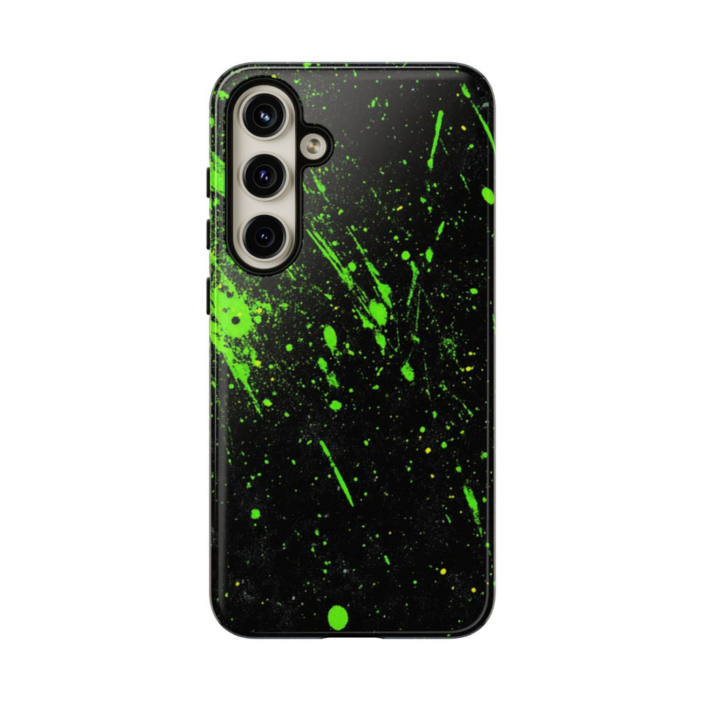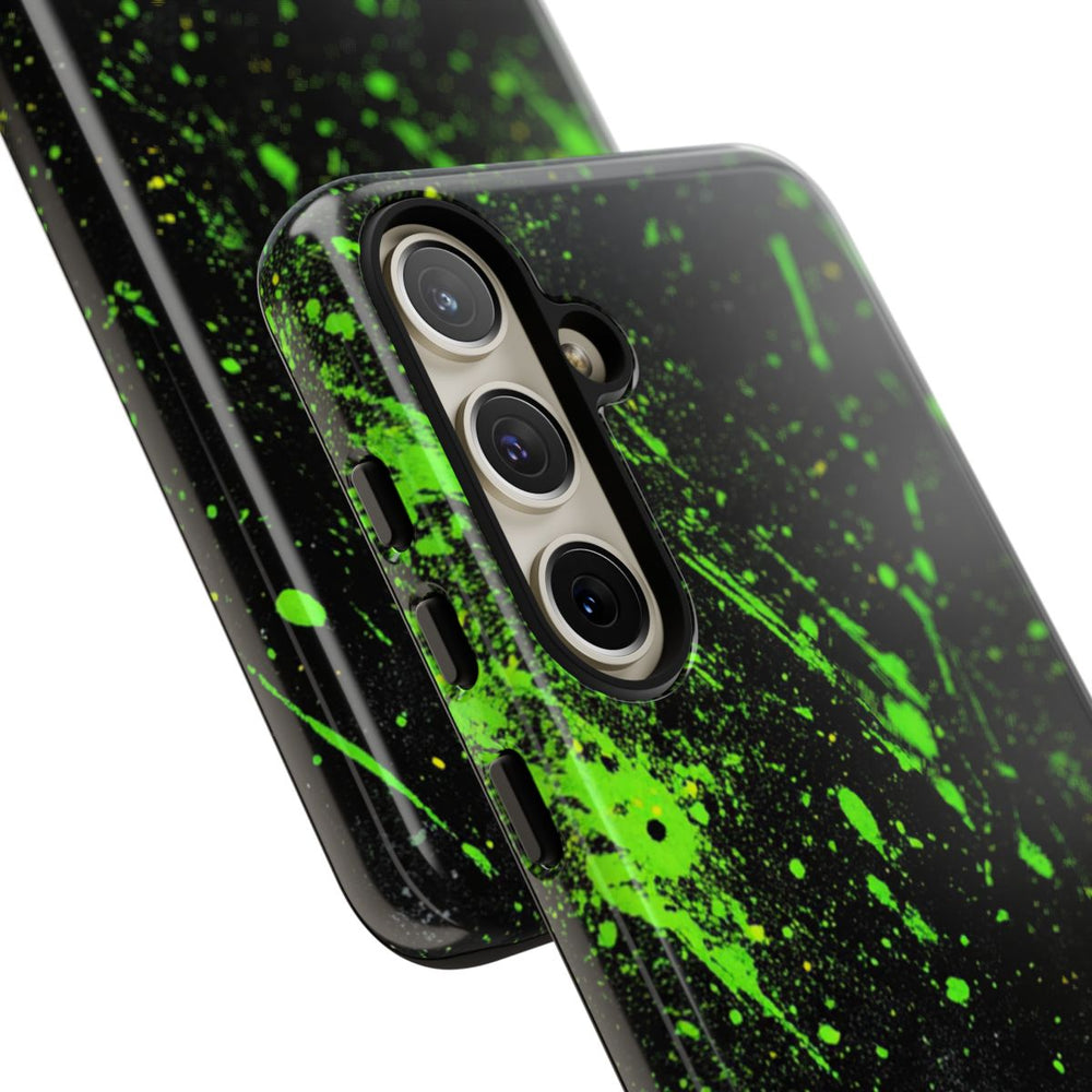 Dit telefoonhoesje heeft een zwarte achtergrond met opvallende neon groene verfspetters en kleine gele stipjes die willekeurig over het oppervlak zijn verspreid. De spetters verschillen in grootte en vorm, wat zorgt voor een abstract en energiek patroon. Het hoesje heeft een glanzende afwerking en is extra stevig dankzij de combinatie van een polycarbonaat buitenkant en een TPU binnenlaag. Zo krijgt je telefoon een dubbele beschermlaag. Dit hoesje ondersteunt draadloos opladen en is bestand tegen weersinvloeden, waardoor het zijn uitstraling langdurig behoudt.