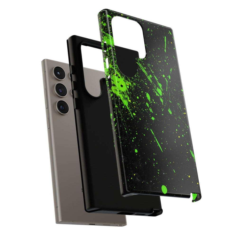 Dit telefoonhoesje heeft een zwarte achtergrond met opvallende neon groene verfspetters en kleine gele stipjes die willekeurig over het oppervlak zijn verspreid. De spetters verschillen in grootte en vorm, wat zorgt voor een abstract en energiek patroon. Het hoesje heeft een glanzende afwerking en is extra stevig dankzij de combinatie van een polycarbonaat buitenkant en een TPU binnenlaag. Zo krijgt je telefoon een dubbele beschermlaag. Dit hoesje ondersteunt draadloos opladen en is bestand tegen weersinvloeden, waardoor het zijn uitstraling langdurig behoudt.