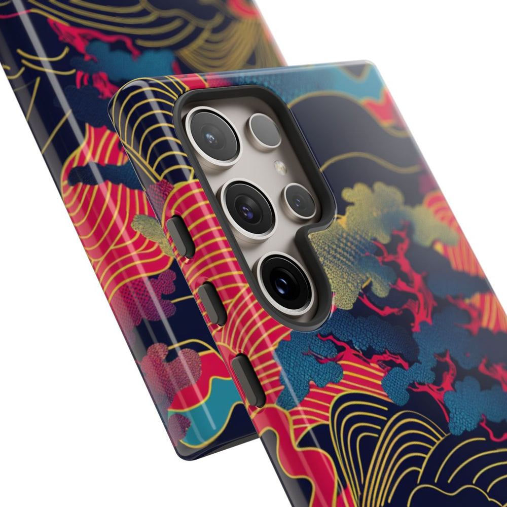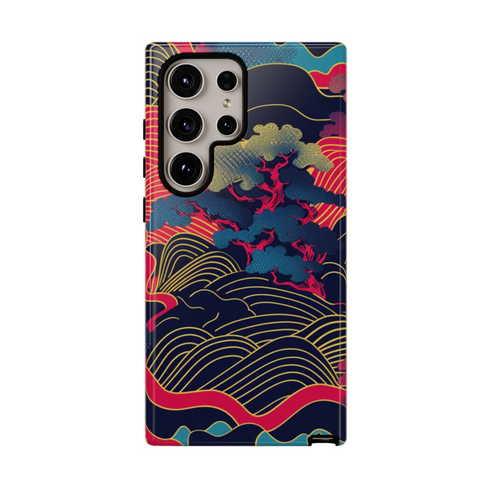 Dit opvallende hoesje is voorzien van een levendig landschapspatroon geïnspireerd op Japanse kunst, met gestileerde bomen en glooiende heuvels. Het ontwerp maakt gebruik van felle neonkleuren zoals felroze, geel, blauw en turquoise op een donkerblauwe achtergrond. De heuvels zijn versierd met gebogen lijnen en de bomen hebben fraai gedetailleerd blad. Het patroon is dynamisch en abstract, en combineert traditionele elementen met een moderne neon kleurstelling. Dit glanzende, stevige hoesje is gemaakt van twee lagen materiaal voor extra bescherming en ondersteunt draadloos opladen.