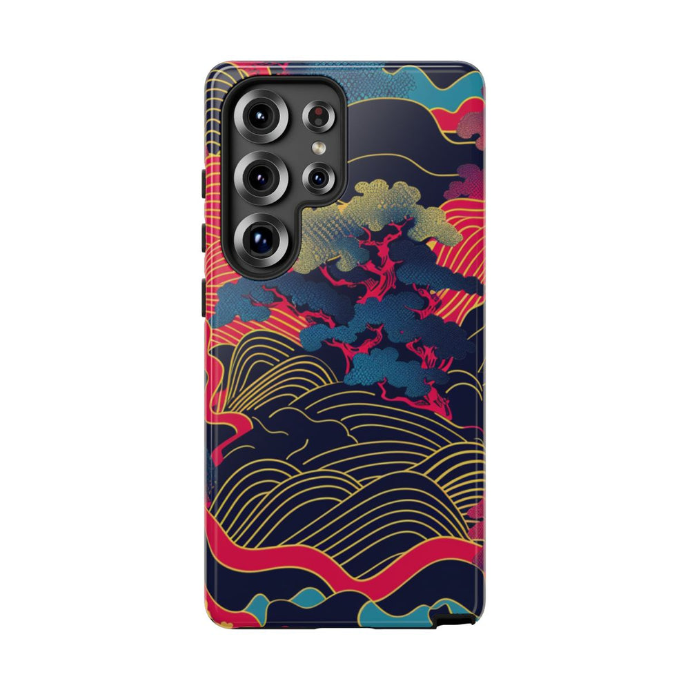 Dit opvallende hoesje is voorzien van een levendig landschapspatroon geïnspireerd op Japanse kunst, met gestileerde bomen en glooiende heuvels. Het ontwerp maakt gebruik van felle neonkleuren zoals felroze, geel, blauw en turquoise op een donkerblauwe achtergrond. De heuvels zijn versierd met gebogen lijnen en de bomen hebben fraai gedetailleerd blad. Het patroon is dynamisch en abstract, en combineert traditionele elementen met een moderne neon kleurstelling. Dit glanzende, stevige hoesje is gemaakt van twee lagen materiaal voor extra bescherming en ondersteunt draadloos opladen.