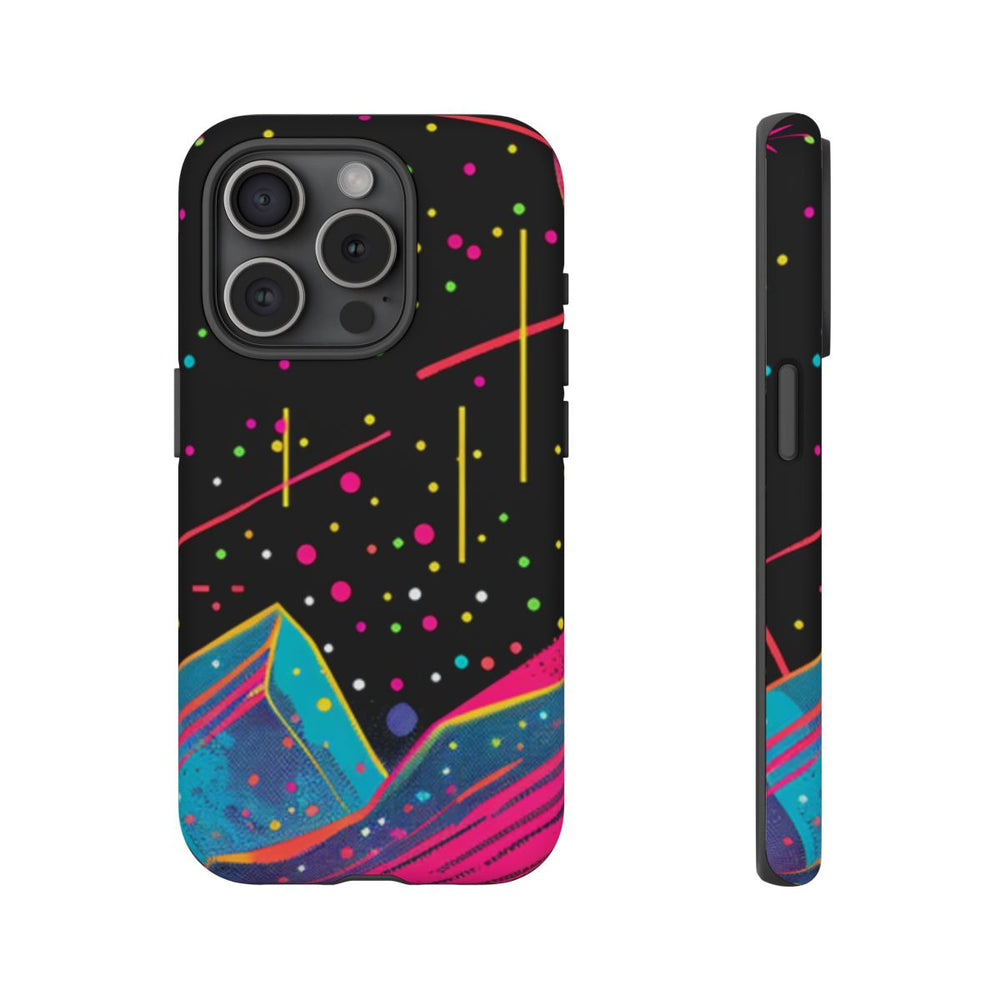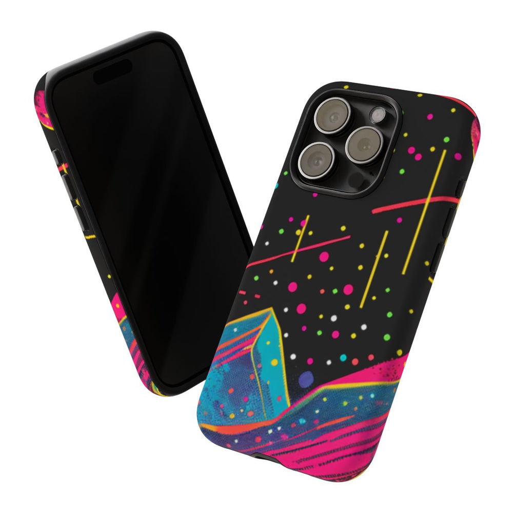 Dit hoesje is voorzien van een opvallend kosmisch tafereel met gestileerde bergen in heldere neonkleuren zoals roze, blauw en oranje. De achtergrond bestaat uit een diepzwarte ruimte vol kleurrijke stippen die sterren en kosmisch stof voorstellen. Twee planeten, één groot en één klein, zijn afgebeeld in gele en roze tinten. Aan de rechterzijde straalt een felgele zon met dynamische stralen. De stijl is krachtig en grafisch, met een retro-futuristisch en abstract ruimtethema. Het matte hoesje bestaat uit twee lagen van polycarbonaat en TPU, wat zorgt voor stevigheid en ondersteuning van draadloos opladen.
