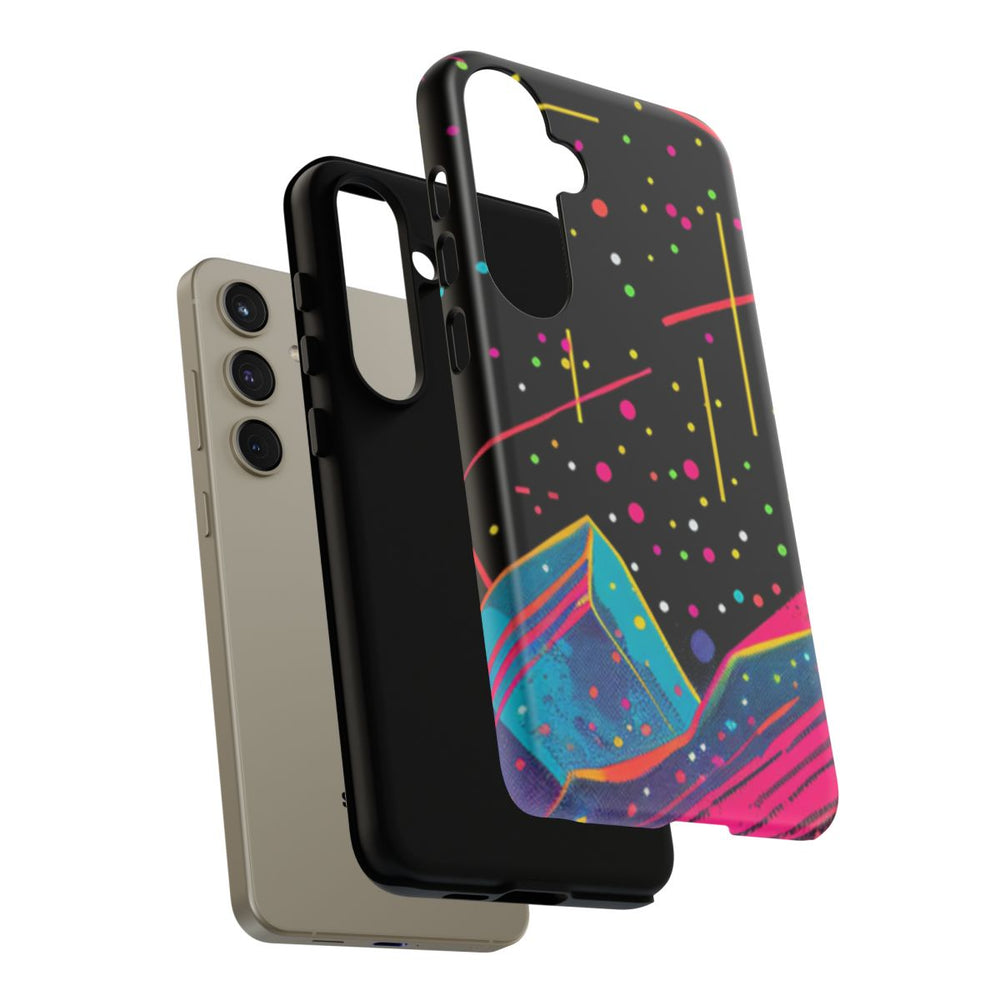 Dit hoesje is voorzien van een opvallend kosmisch tafereel met gestileerde bergen in heldere neonkleuren zoals roze, blauw en oranje. De achtergrond bestaat uit een diepzwarte ruimte vol kleurrijke stippen die sterren en kosmisch stof voorstellen. Twee planeten, één groot en één klein, zijn afgebeeld in gele en roze tinten. Aan de rechterzijde straalt een felgele zon met dynamische stralen. De stijl is krachtig en grafisch, met een retro-futuristisch en abstract ruimtethema. Het matte hoesje bestaat uit twee lagen van polycarbonaat en TPU, wat zorgt voor stevigheid en ondersteuning van draadloos opladen.