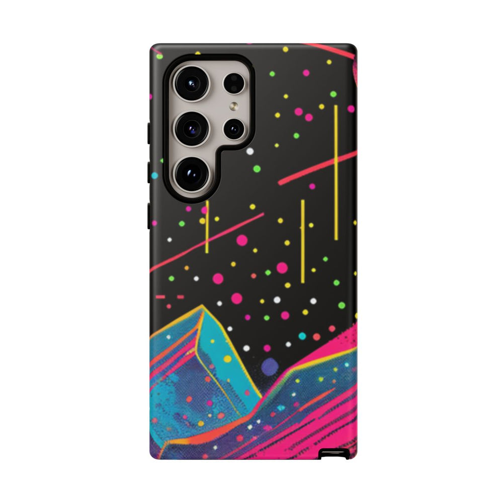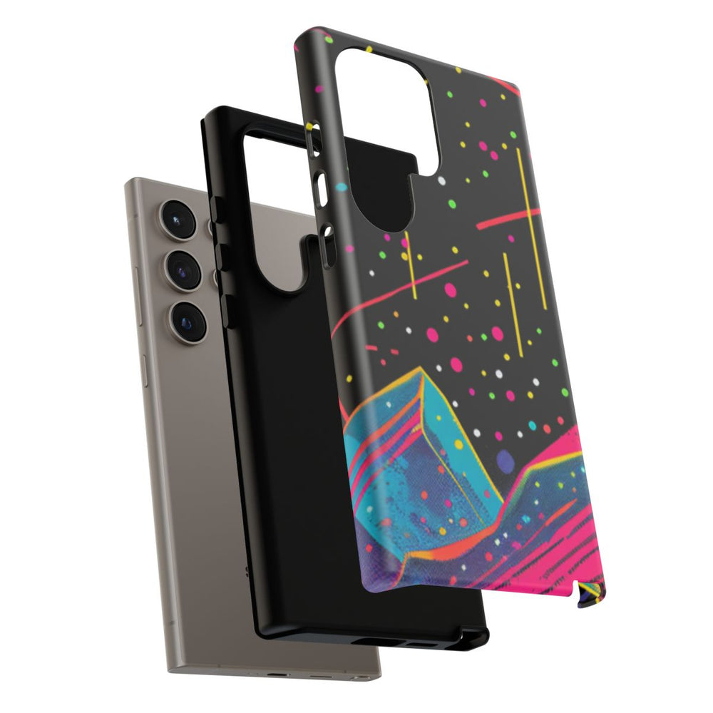 Dit hoesje is voorzien van een opvallend kosmisch tafereel met gestileerde bergen in heldere neonkleuren zoals roze, blauw en oranje. De achtergrond bestaat uit een diepzwarte ruimte vol kleurrijke stippen die sterren en kosmisch stof voorstellen. Twee planeten, één groot en één klein, zijn afgebeeld in gele en roze tinten. Aan de rechterzijde straalt een felgele zon met dynamische stralen. De stijl is krachtig en grafisch, met een retro-futuristisch en abstract ruimtethema. Het matte hoesje bestaat uit twee lagen van polycarbonaat en TPU, wat zorgt voor stevigheid en ondersteuning van draadloos opladen.