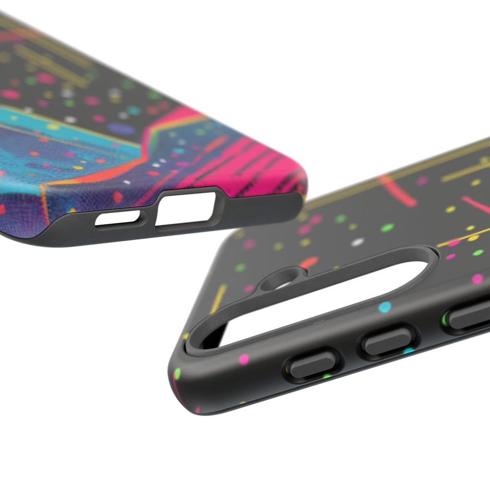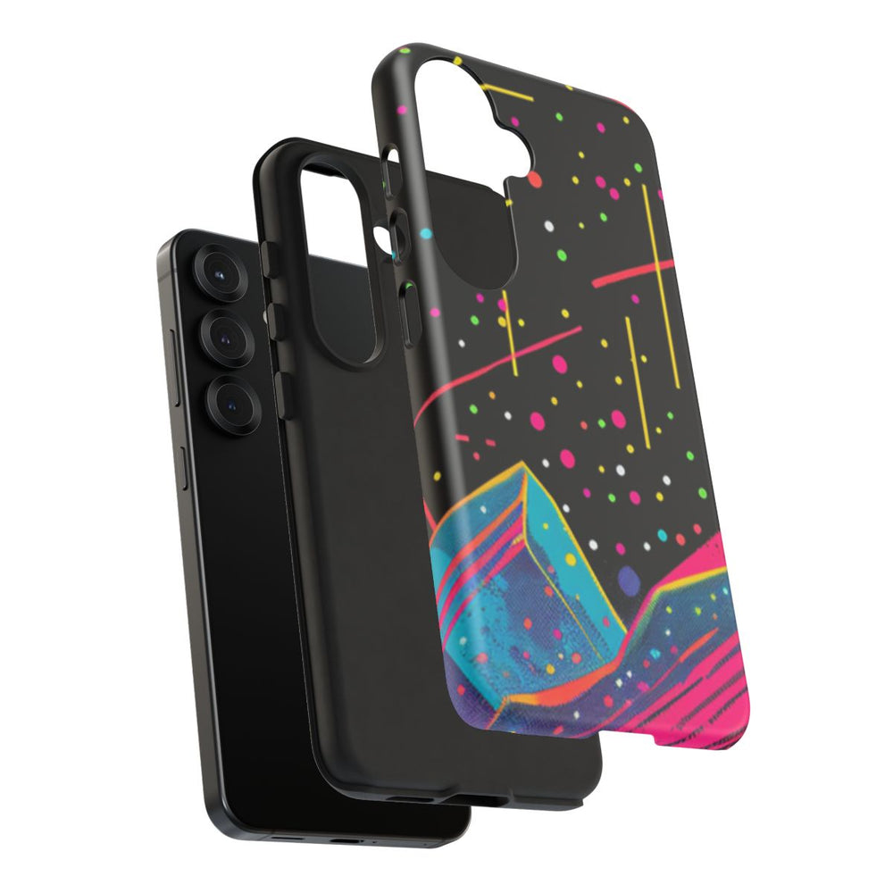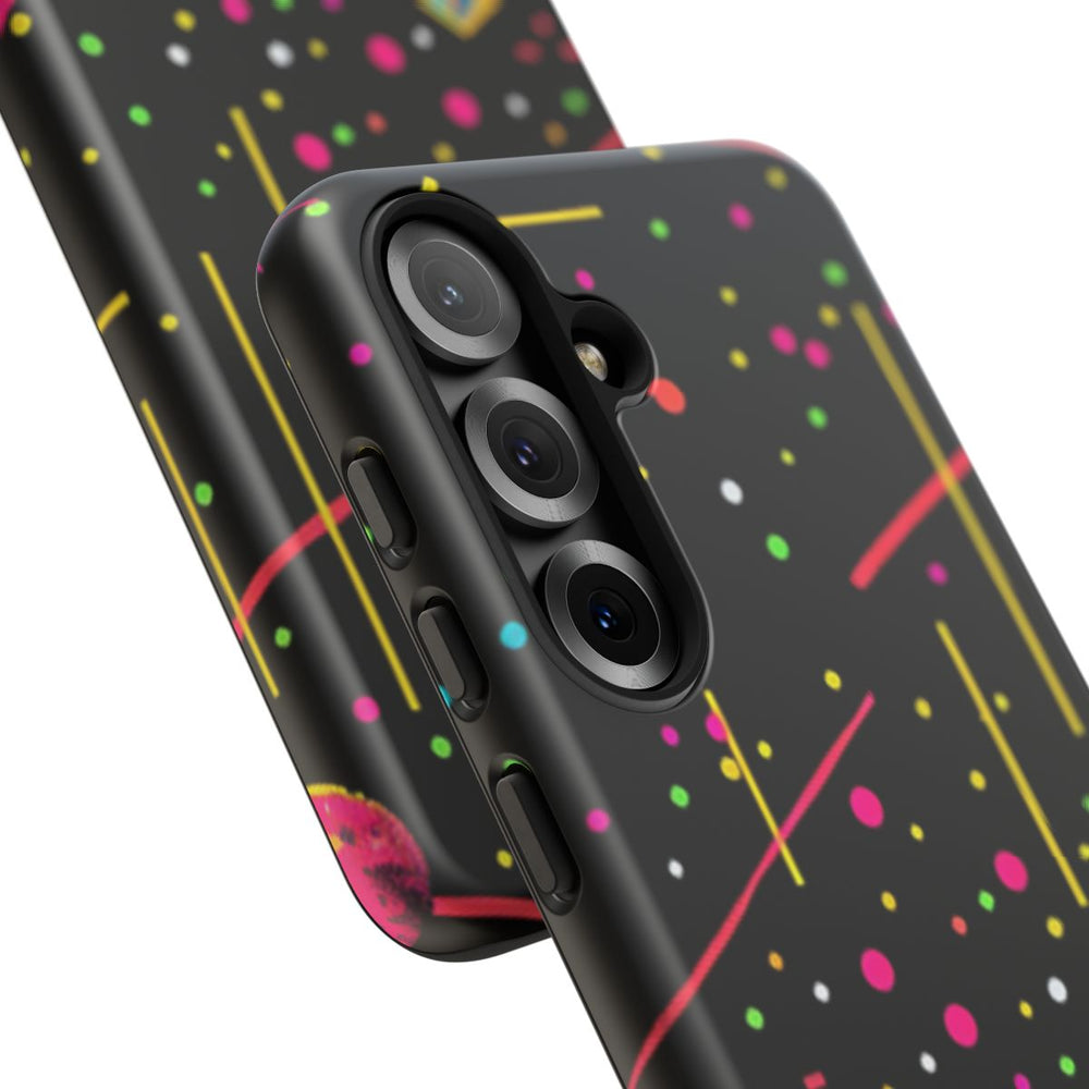 Dit hoesje is voorzien van een opvallend kosmisch tafereel met gestileerde bergen in heldere neonkleuren zoals roze, blauw en oranje. De achtergrond bestaat uit een diepzwarte ruimte vol kleurrijke stippen die sterren en kosmisch stof voorstellen. Twee planeten, één groot en één klein, zijn afgebeeld in gele en roze tinten. Aan de rechterzijde straalt een felgele zon met dynamische stralen. De stijl is krachtig en grafisch, met een retro-futuristisch en abstract ruimtethema. Het matte hoesje bestaat uit twee lagen van polycarbonaat en TPU, wat zorgt voor stevigheid en ondersteuning van draadloos opladen.