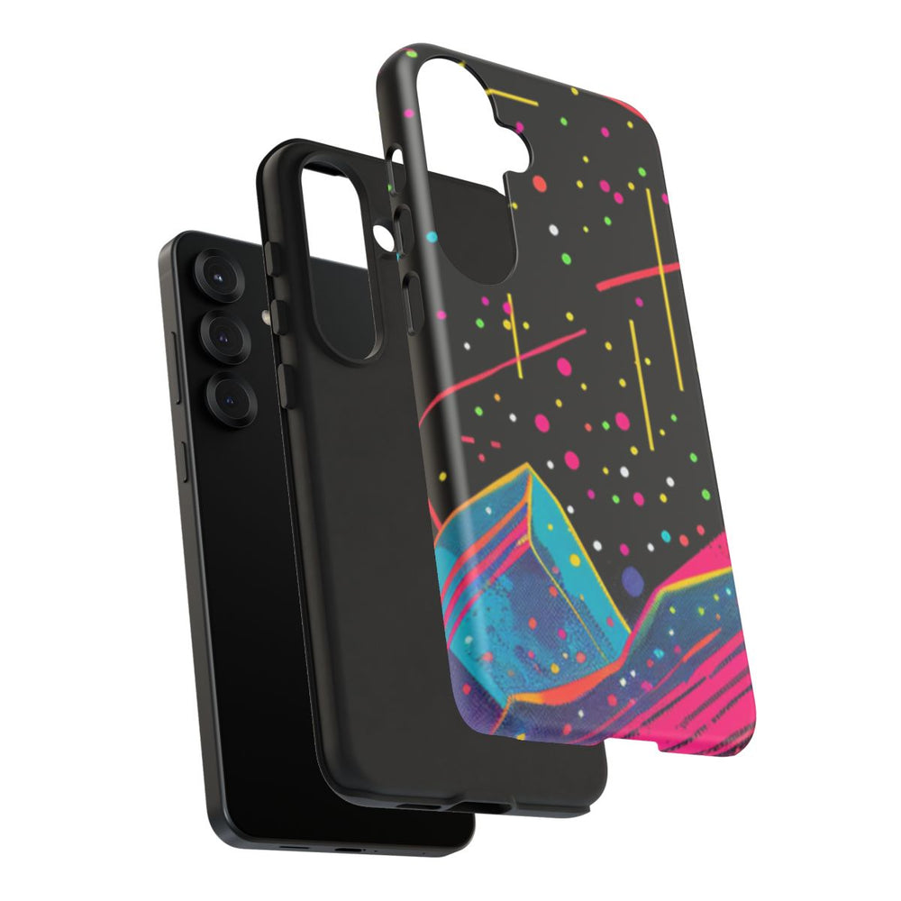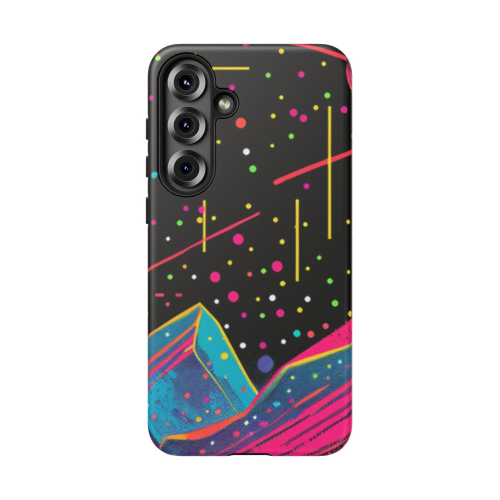 Dit hoesje is voorzien van een opvallend kosmisch tafereel met gestileerde bergen in heldere neonkleuren zoals roze, blauw en oranje. De achtergrond bestaat uit een diepzwarte ruimte vol kleurrijke stippen die sterren en kosmisch stof voorstellen. Twee planeten, één groot en één klein, zijn afgebeeld in gele en roze tinten. Aan de rechterzijde straalt een felgele zon met dynamische stralen. De stijl is krachtig en grafisch, met een retro-futuristisch en abstract ruimtethema. Het matte hoesje bestaat uit twee lagen van polycarbonaat en TPU, wat zorgt voor stevigheid en ondersteuning van draadloos opladen.