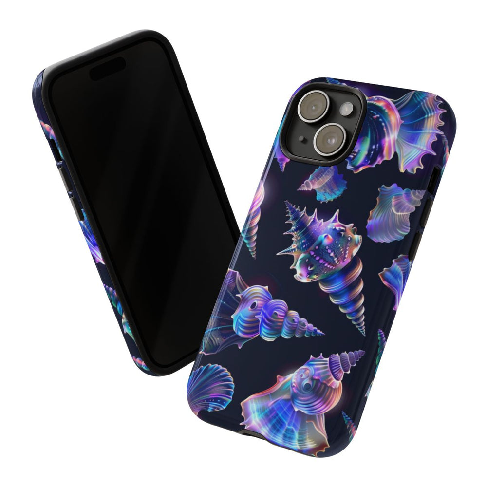 Dit telefoonhoesje heeft een naadloos patroon van diverse schelpen in levendige pastel- en neontinten. De schelpen hebben uiteenlopende vormen en texturen en lichten op in iriserende kleuren zoals blauw, paars, roze en groen op een donkere achtergrond. Het patroon herhaalt zich vloeiend en zorgt voor een opvallend en dynamisch geheel. Het hoesje is glanzend en extra stevig door de dubbele laag van een polycarbonaat buitenkant en een TPU-binnenzijde. Dit zorgt voor duurzaamheid en extra bescherming, ook buitenshuis. Geschikt voor draadloos opladen.