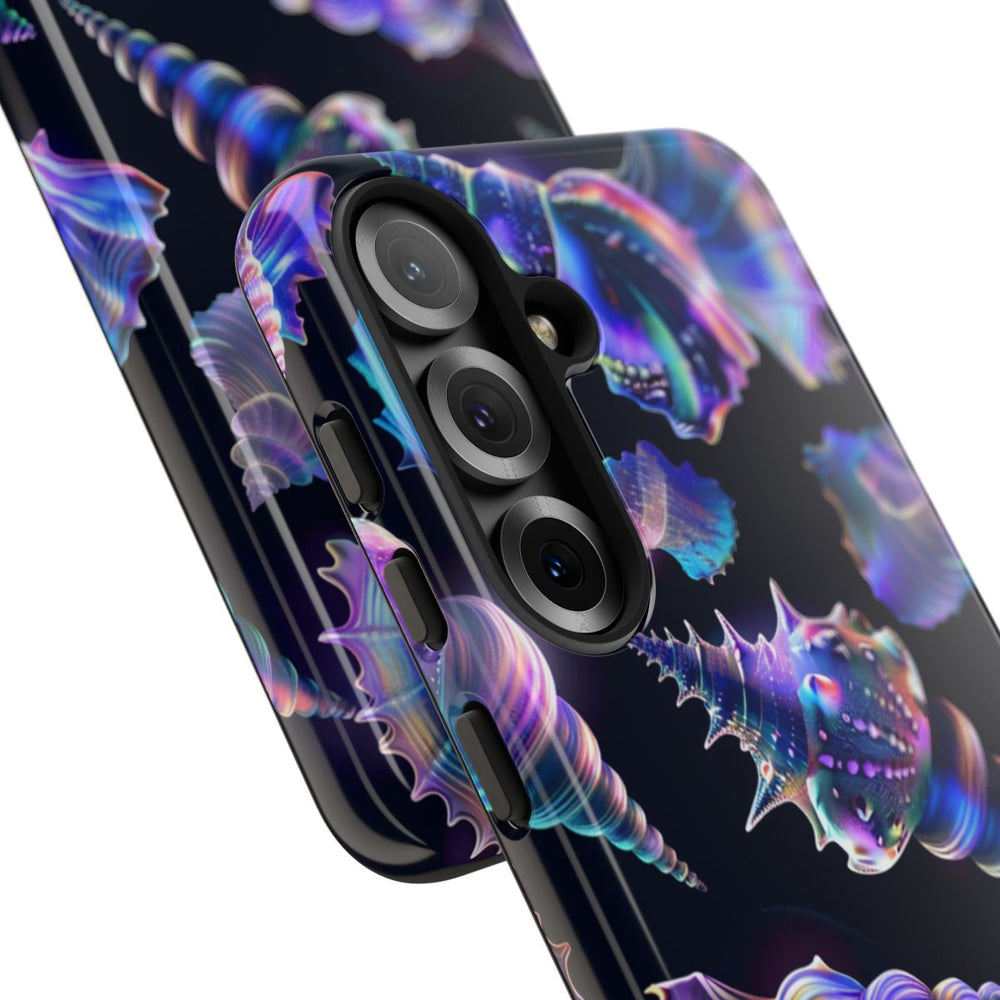 Dit telefoonhoesje heeft een naadloos patroon van diverse schelpen in levendige pastel- en neontinten. De schelpen hebben uiteenlopende vormen en texturen en lichten op in iriserende kleuren zoals blauw, paars, roze en groen op een donkere achtergrond. Het patroon herhaalt zich vloeiend en zorgt voor een opvallend en dynamisch geheel. Het hoesje is glanzend en extra stevig door de dubbele laag van een polycarbonaat buitenkant en een TPU-binnenzijde. Dit zorgt voor duurzaamheid en extra bescherming, ook buitenshuis. Geschikt voor draadloos opladen.