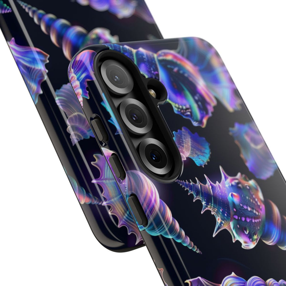 Dit telefoonhoesje heeft een naadloos patroon van diverse schelpen in levendige pastel- en neontinten. De schelpen hebben uiteenlopende vormen en texturen en lichten op in iriserende kleuren zoals blauw, paars, roze en groen op een donkere achtergrond. Het patroon herhaalt zich vloeiend en zorgt voor een opvallend en dynamisch geheel. Het hoesje is glanzend en extra stevig door de dubbele laag van een polycarbonaat buitenkant en een TPU-binnenzijde. Dit zorgt voor duurzaamheid en extra bescherming, ook buitenshuis. Geschikt voor draadloos opladen.