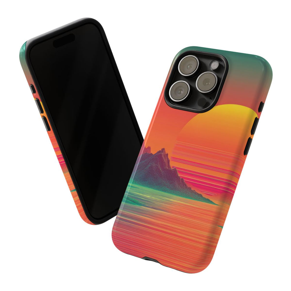 Dit ontwerp toont een levendig digitaal landschap met scherpe, grillige bergen aan weerszijden van een kalme zee. Een grote zon gaat onder aan de horizon en verspreidt heldere gele en oranje tinten over de lucht en het water. De bergen zijn afgewerkt met teal- en groenkleurige lijnen, wat zorgt voor een getextureerde, futuristische uitstraling. De lucht verloopt van oranje bij de horizon naar teal bovenin, wat het kleurrijke en stralende palet versterkt. Het hoesje bestaat uit twee lagen: een glanzende polycarbonaat buitenkant en een TPU-binnenzijde, voor optimale bescherming en ondersteuning van draadloos opladen.