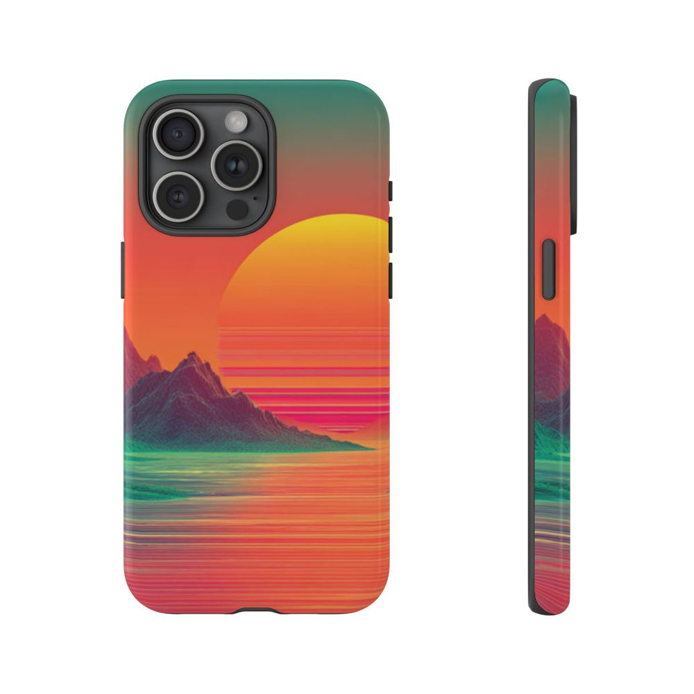 Dit ontwerp toont een levendig digitaal landschap met scherpe, grillige bergen aan weerszijden van een kalme zee. Een grote zon gaat onder aan de horizon en verspreidt heldere gele en oranje tinten over de lucht en het water. De bergen zijn afgewerkt met teal- en groenkleurige lijnen, wat zorgt voor een getextureerde, futuristische uitstraling. De lucht verloopt van oranje bij de horizon naar teal bovenin, wat het kleurrijke en stralende palet versterkt. Het hoesje bestaat uit twee lagen: een glanzende polycarbonaat buitenkant en een TPU-binnenzijde, voor optimale bescherming en ondersteuning van draadloos opladen.