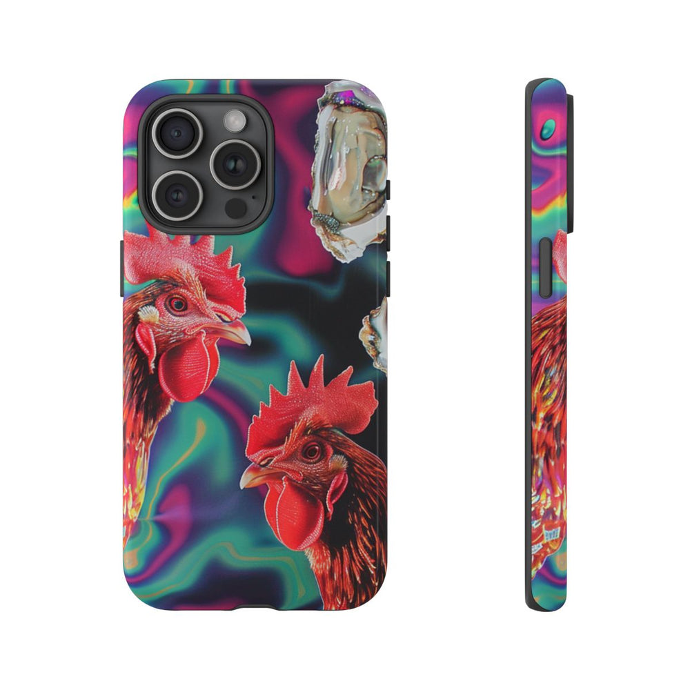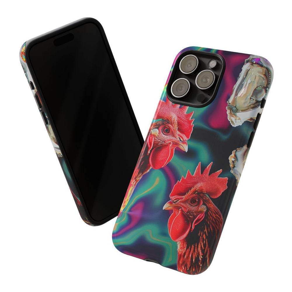 Dit telefoonhoesje heeft een opvallend ontwerp met kleurrijke hanen in neonkleuren, voorzien van gedetailleerde rode kammen en lellen. Rondom de hanen zijn realistische oesters te zien met glanzende, spiegelende schelpen. De achtergrond bestaat uit een golvend, veelkleurig patroon dat doet denken aan een zilveren parel met heldere, iriserende tinten groen, paars en roze. De afbeelding is gedrukt op een glanzend, stevig hoesje met een buitenlaag van polycarbonaat en een binnenzijde van TPU. Dit zorgt voor dubbele bescherming en maakt draadloos opladen mogelijk.