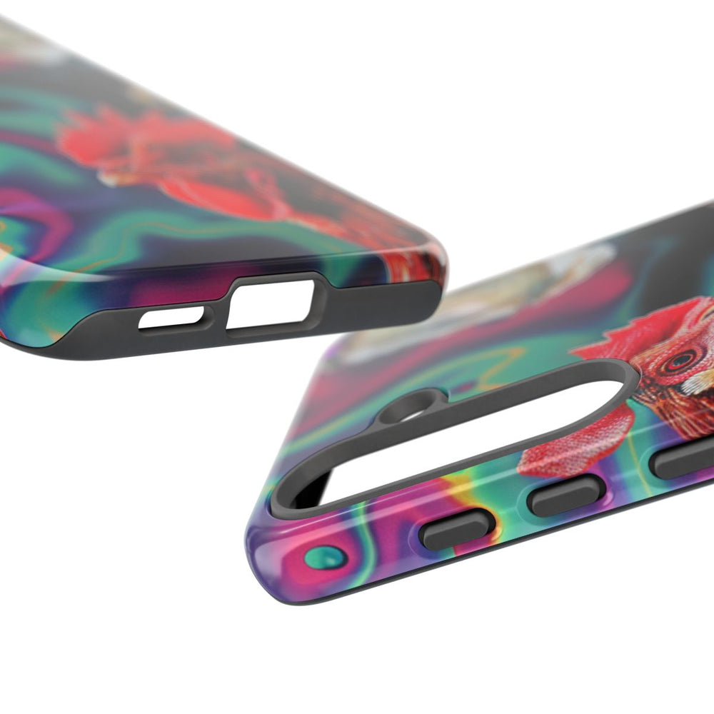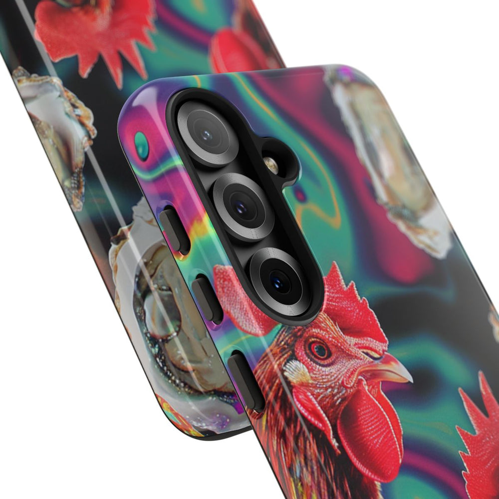 Dit telefoonhoesje heeft een opvallend ontwerp met kleurrijke hanen in neonkleuren, voorzien van gedetailleerde rode kammen en lellen. Rondom de hanen zijn realistische oesters te zien met glanzende, spiegelende schelpen. De achtergrond bestaat uit een golvend, veelkleurig patroon dat doet denken aan een zilveren parel met heldere, iriserende tinten groen, paars en roze. De afbeelding is gedrukt op een glanzend, stevig hoesje met een buitenlaag van polycarbonaat en een binnenzijde van TPU. Dit zorgt voor dubbele bescherming en maakt draadloos opladen mogelijk.