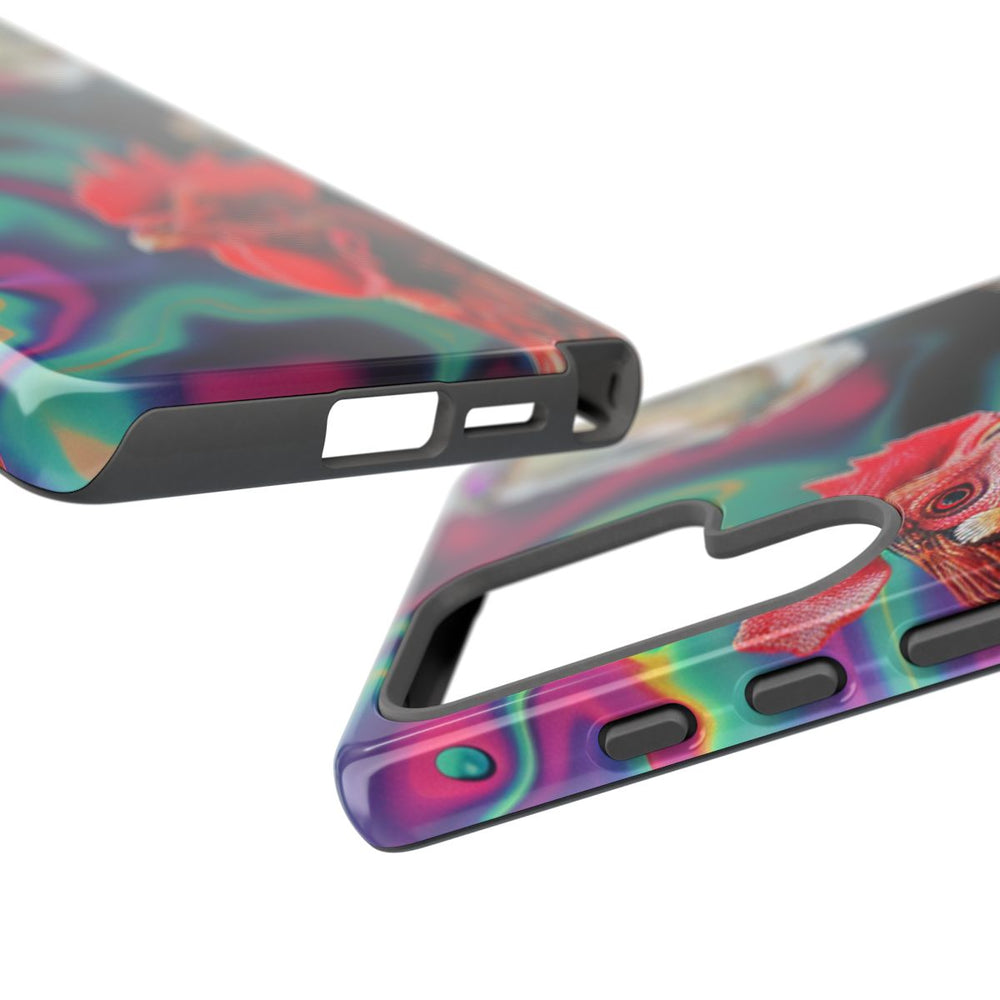Dit telefoonhoesje heeft een opvallend ontwerp met kleurrijke hanen in neonkleuren, voorzien van gedetailleerde rode kammen en lellen. Rondom de hanen zijn realistische oesters te zien met glanzende, spiegelende schelpen. De achtergrond bestaat uit een golvend, veelkleurig patroon dat doet denken aan een zilveren parel met heldere, iriserende tinten groen, paars en roze. De afbeelding is gedrukt op een glanzend, stevig hoesje met een buitenlaag van polycarbonaat en een binnenzijde van TPU. Dit zorgt voor dubbele bescherming en maakt draadloos opladen mogelijk.