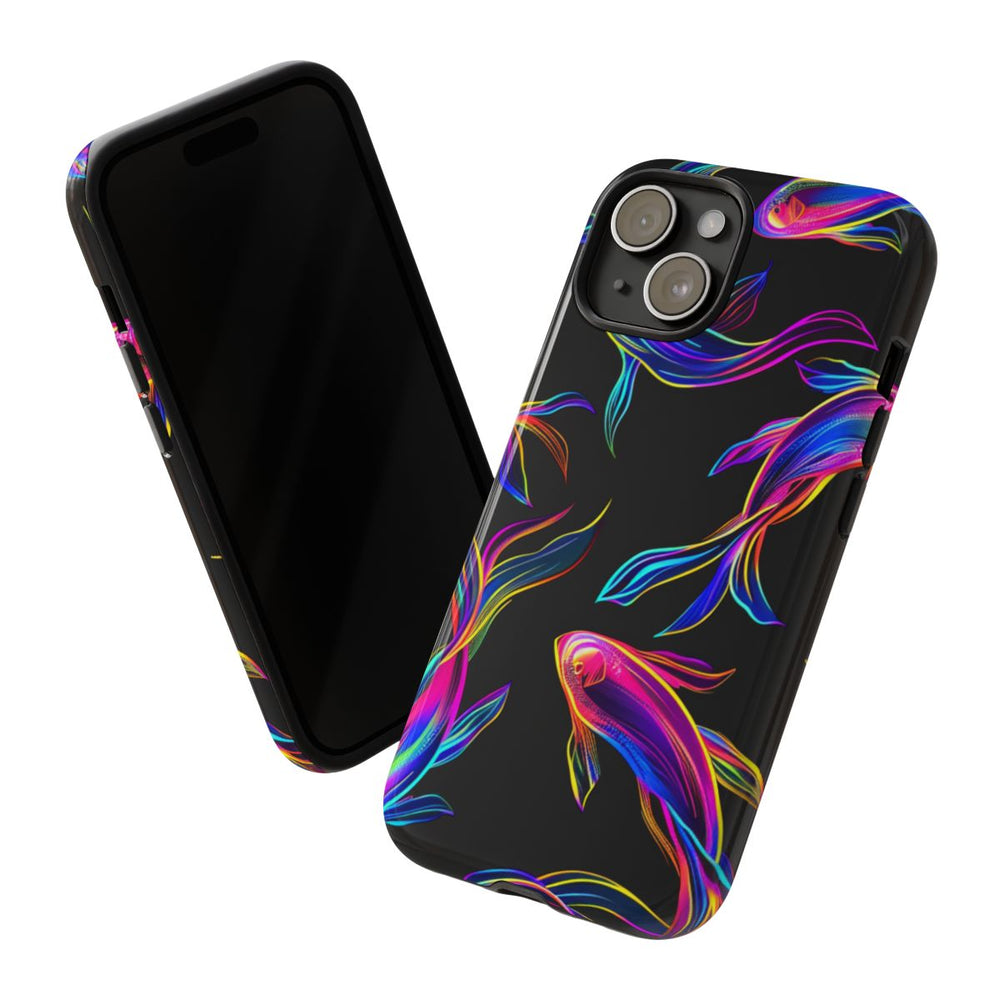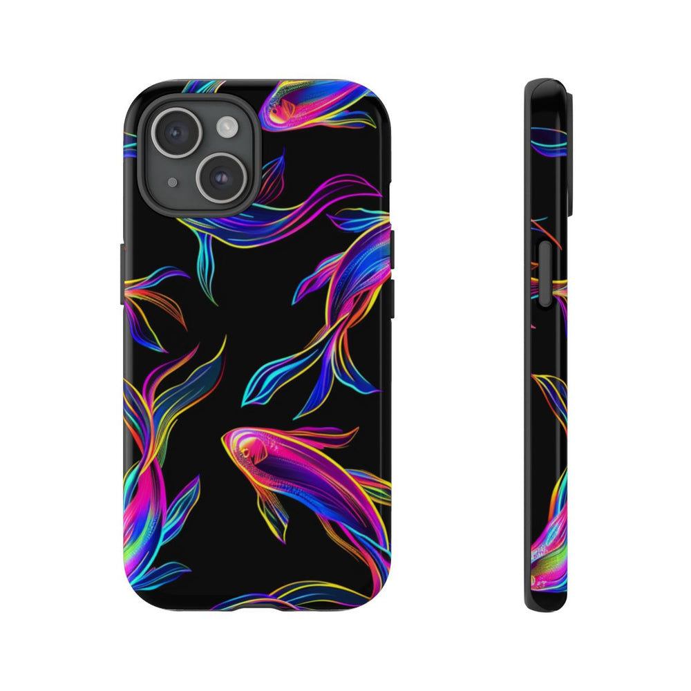 Dit telefoonhoesje heeft een naadloos patroon van neonkleurige vissen met lange, sierlijke staarten op een diepzwarte achtergrond. De vissen zijn getekend in levendige tinten blauw, roze, paars, geel en oranje, wat zorgt voor een opvallend lichtgevend effect. Het patroon oogt dynamisch en speels, doordat de vissen alle kanten op lijken te zwemmen. Het hoesje is glanzend en stevig, vervaardigd uit polycarbonaat en TPU voor dubbele bescherming. Daarnaast ondersteunt het draadloos opladen. De zwarte achtergrond laat de felle neonkleuren extra goed uitkomen.