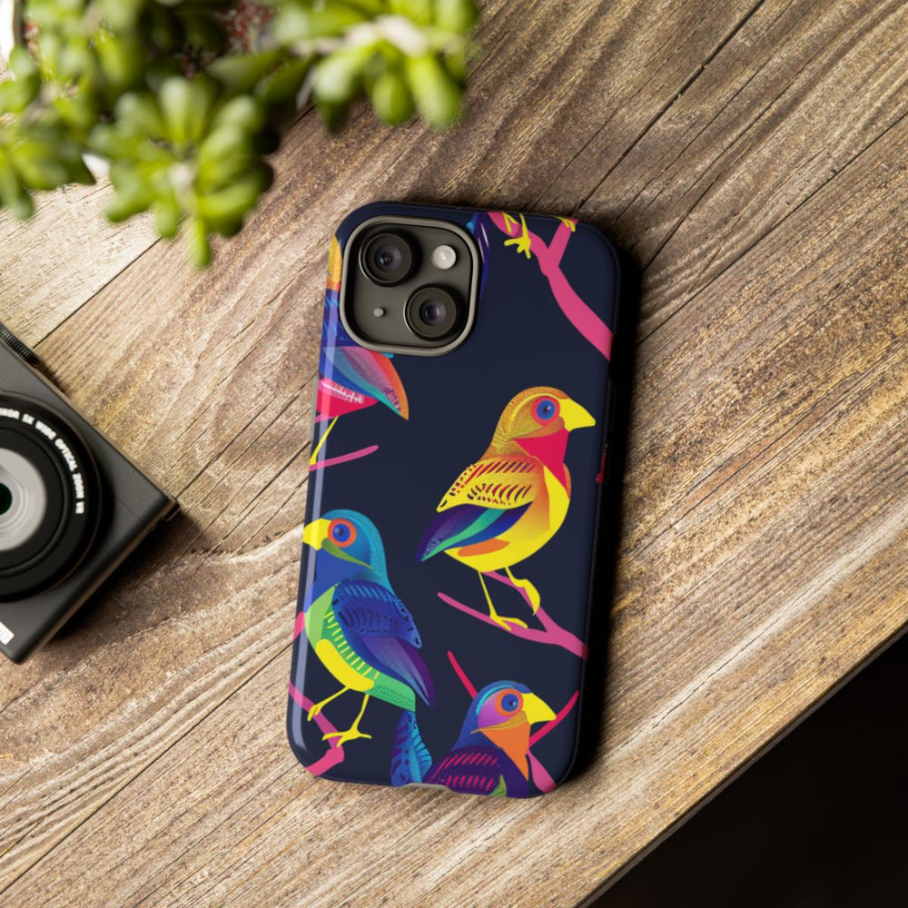 Dit telefoonhoesje heeft een opvallend ontwerp met felgekleurde vogels in neonkleuren die op helderroze takken zitten tegen een donkerblauwe achtergrond. De vogels zijn uitgevoerd in levendige tinten geel, blauw, rood, groen en paars, wat zorgt voor een prachtig contrast met de donkere ondergrond. Het patroon loopt naadloos door, waardoor het hoesje rondom is voorzien van het design. Het hoesje is glanzend afgewerkt en bestaat uit twee stevige lagen voor extra bescherming en duurzaamheid. Bovendien ondersteunt het draadloos opladen.