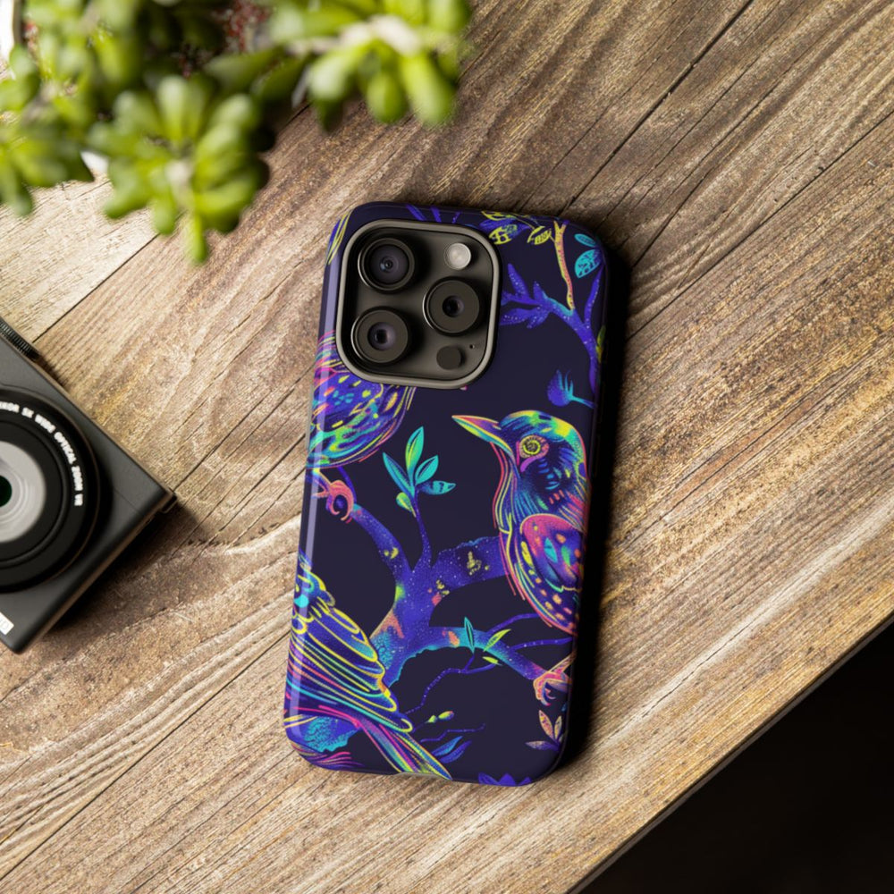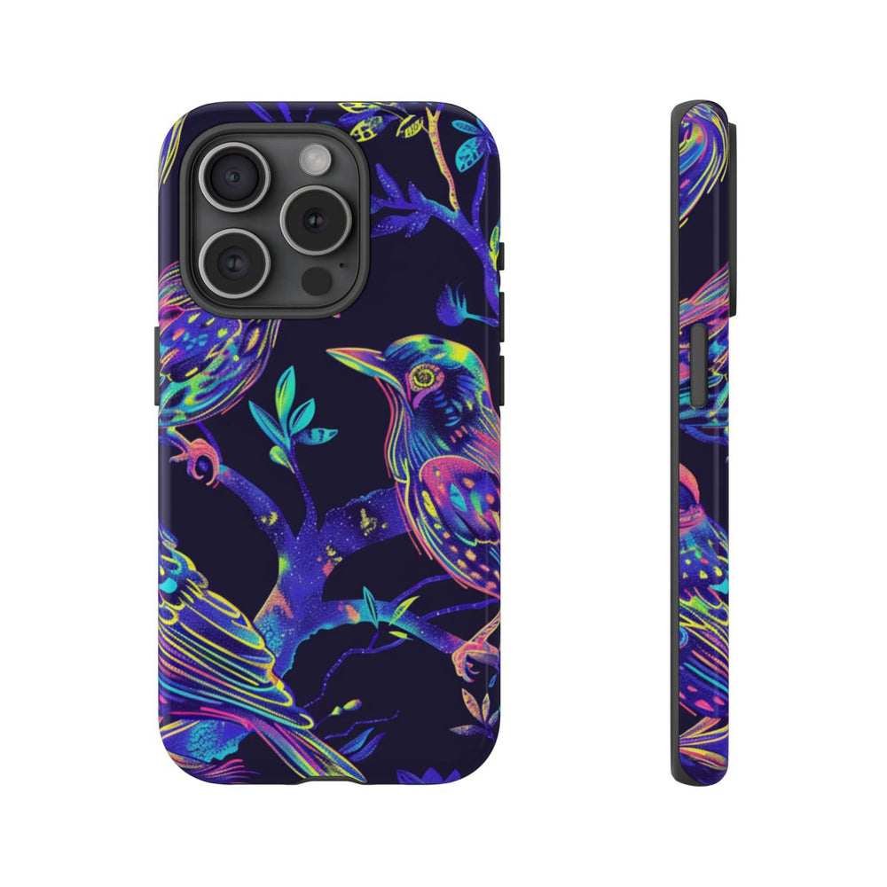 Dit ontwerp toont meerdere vogels die op takken met bladeren zitten, allemaal geïllustreerd in levendige neontinten zoals blauw, geel, roze en groen. De vogels en het gebladerte zijn voorzien van een lichtgevend effect tegen een donkerblauwe achtergrond, wat zorgt voor een opvallend contrast. Het patroon is naadloos en herhalend, perfect voor een glanzend en stevig hoesje van duurzaam polycarbonaat en TPU. Dit hoesje biedt uitstekende bescherming en is geschikt voor draadloos opladen.