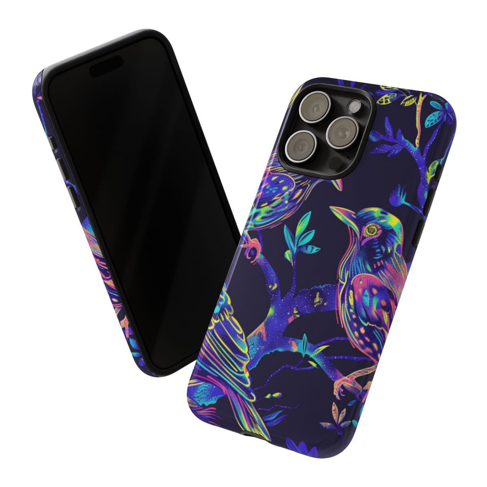 Dit ontwerp toont meerdere vogels die op takken met bladeren zitten, allemaal geïllustreerd in levendige neontinten zoals blauw, geel, roze en groen. De vogels en het gebladerte zijn voorzien van een lichtgevend effect tegen een donkerblauwe achtergrond, wat zorgt voor een opvallend contrast. Het patroon is naadloos en herhalend, perfect voor een glanzend en stevig hoesje van duurzaam polycarbonaat en TPU. Dit hoesje biedt uitstekende bescherming en is geschikt voor draadloos opladen.