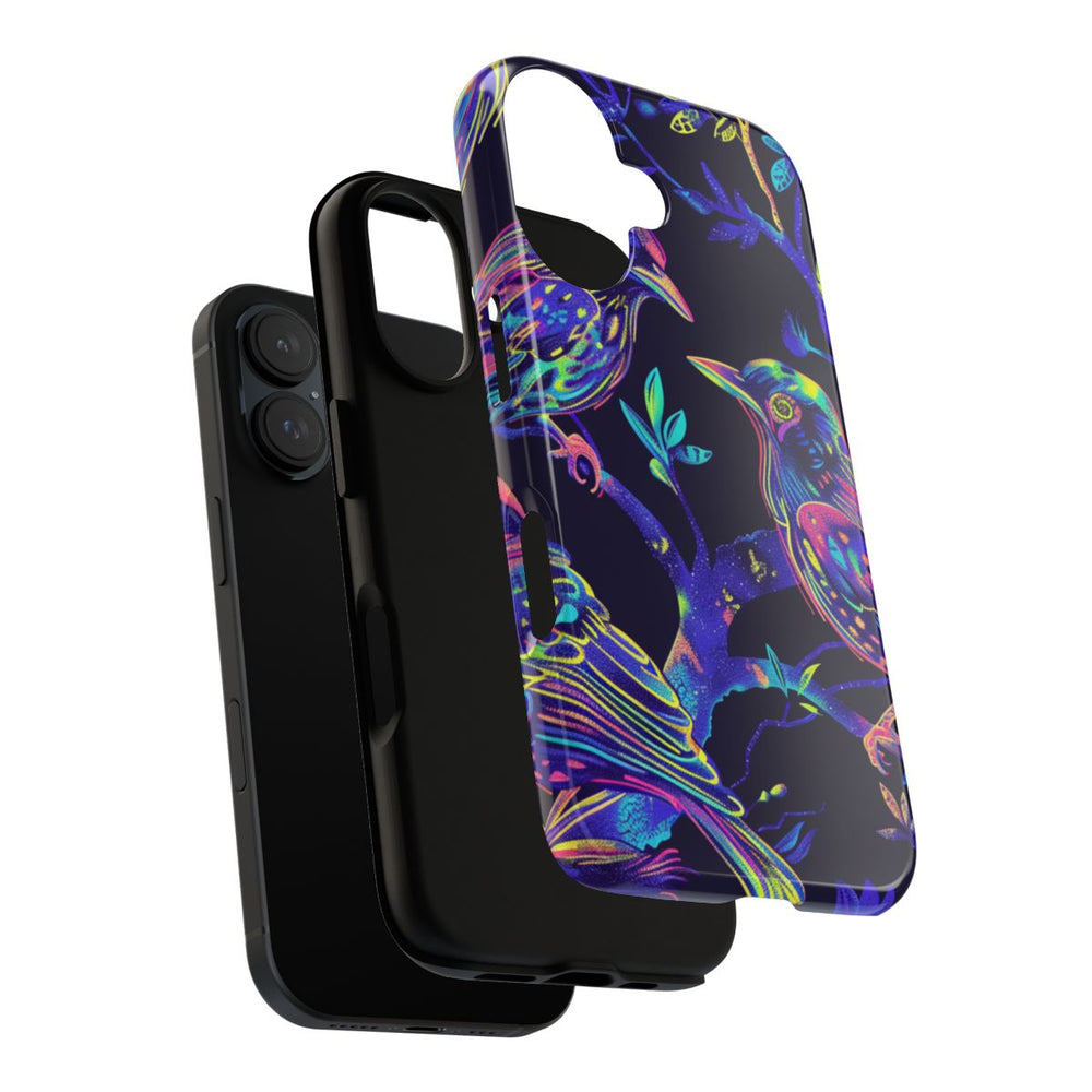 Dit ontwerp toont meerdere vogels die op takken met bladeren zitten, allemaal geïllustreerd in levendige neontinten zoals blauw, geel, roze en groen. De vogels en het gebladerte zijn voorzien van een lichtgevend effect tegen een donkerblauwe achtergrond, wat zorgt voor een opvallend contrast. Het patroon is naadloos en herhalend, perfect voor een glanzend en stevig hoesje van duurzaam polycarbonaat en TPU. Dit hoesje biedt uitstekende bescherming en is geschikt voor draadloos opladen.
