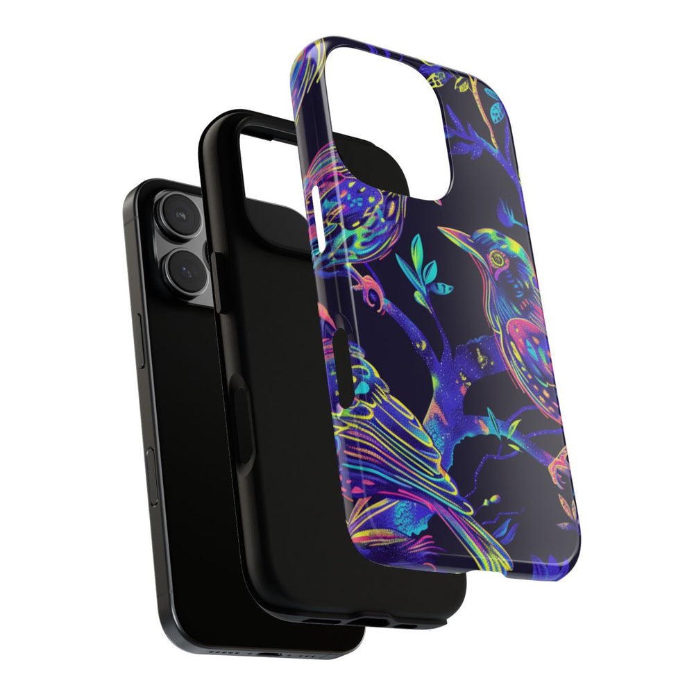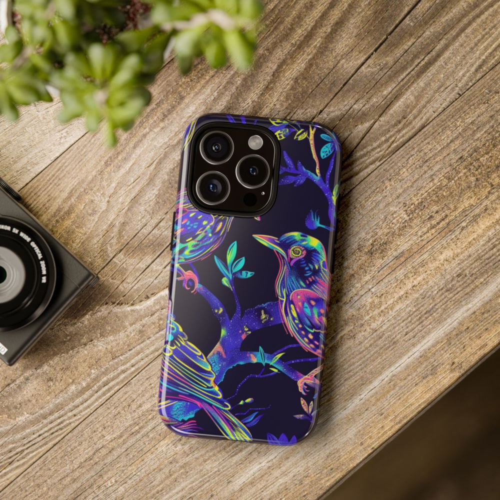 Dit ontwerp toont meerdere vogels die op takken met bladeren zitten, allemaal geïllustreerd in levendige neontinten zoals blauw, geel, roze en groen. De vogels en het gebladerte zijn voorzien van een lichtgevend effect tegen een donkerblauwe achtergrond, wat zorgt voor een opvallend contrast. Het patroon is naadloos en herhalend, perfect voor een glanzend en stevig hoesje van duurzaam polycarbonaat en TPU. Dit hoesje biedt uitstekende bescherming en is geschikt voor draadloos opladen.