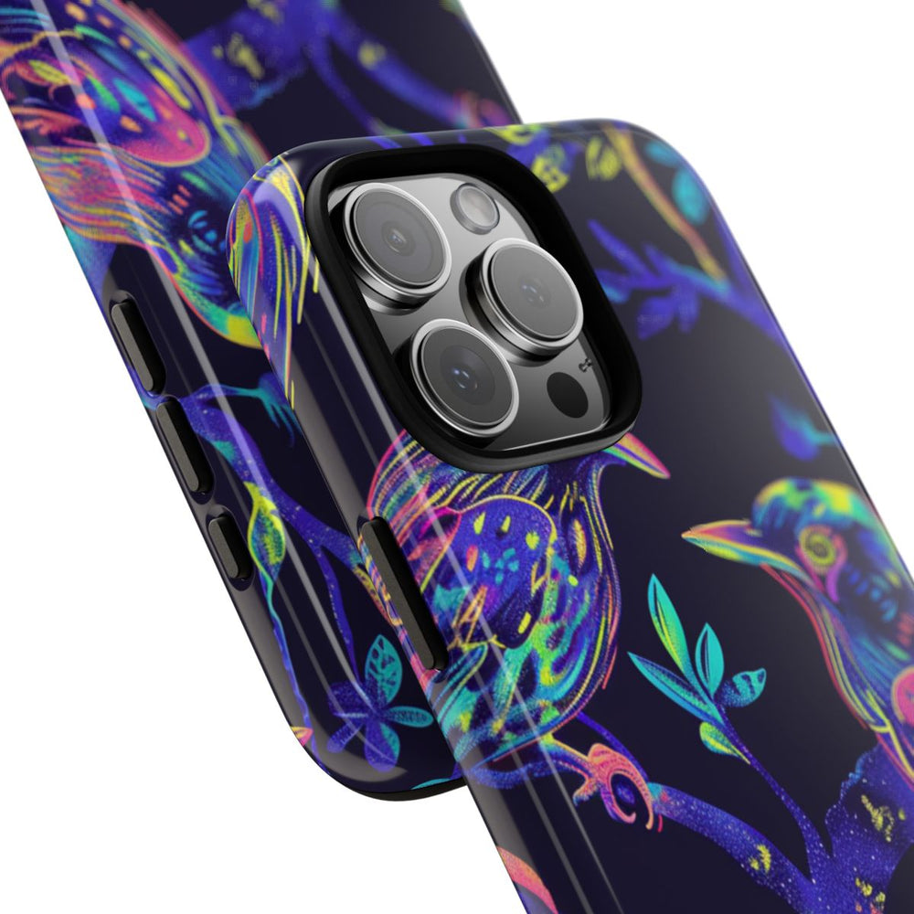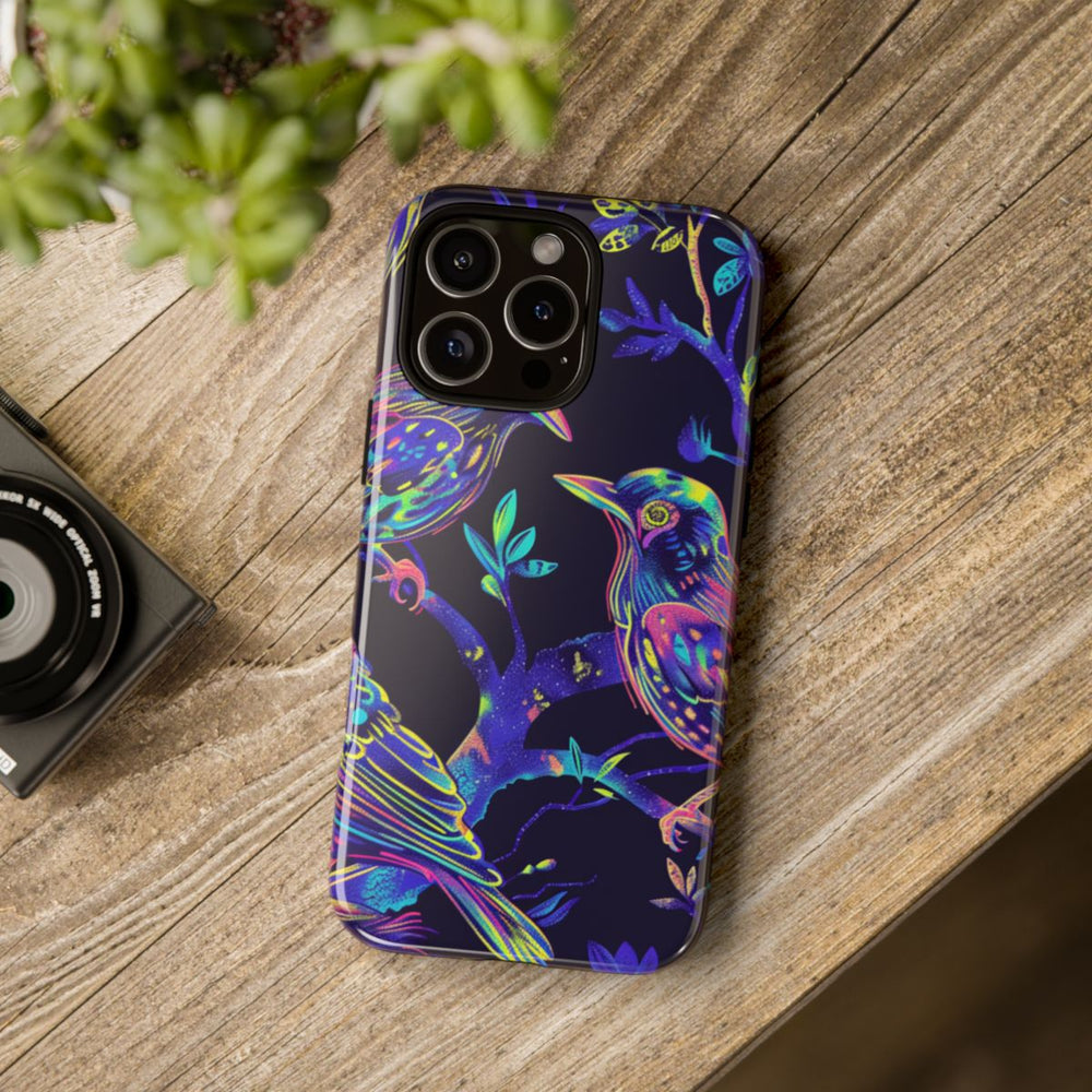 Dit ontwerp toont meerdere vogels die op takken met bladeren zitten, allemaal geïllustreerd in levendige neontinten zoals blauw, geel, roze en groen. De vogels en het gebladerte zijn voorzien van een lichtgevend effect tegen een donkerblauwe achtergrond, wat zorgt voor een opvallend contrast. Het patroon is naadloos en herhalend, perfect voor een glanzend en stevig hoesje van duurzaam polycarbonaat en TPU. Dit hoesje biedt uitstekende bescherming en is geschikt voor draadloos opladen.