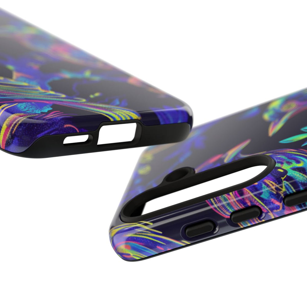 Dit ontwerp toont meerdere vogels die op takken met bladeren zitten, allemaal geïllustreerd in levendige neontinten zoals blauw, geel, roze en groen. De vogels en het gebladerte zijn voorzien van een lichtgevend effect tegen een donkerblauwe achtergrond, wat zorgt voor een opvallend contrast. Het patroon is naadloos en herhalend, perfect voor een glanzend en stevig hoesje van duurzaam polycarbonaat en TPU. Dit hoesje biedt uitstekende bescherming en is geschikt voor draadloos opladen.
