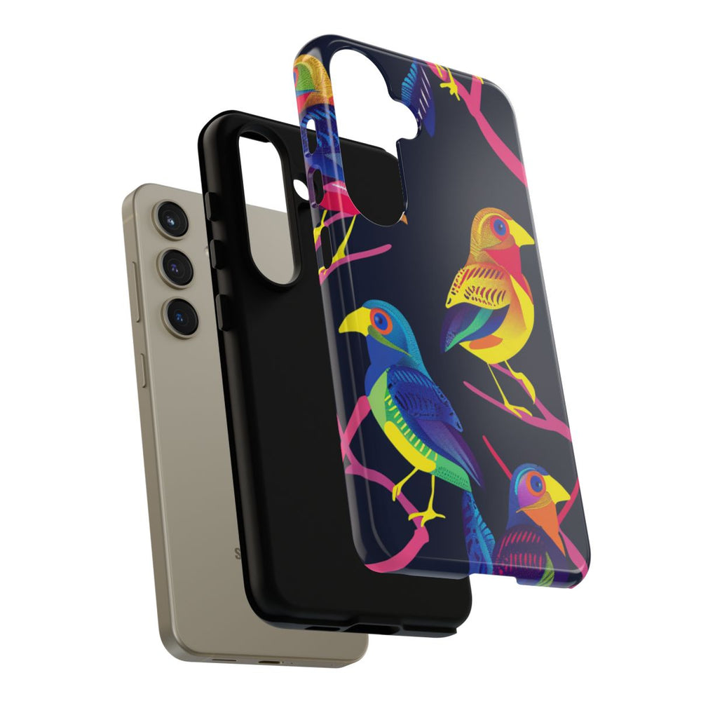 Dit telefoonhoesje heeft een opvallend ontwerp met felgekleurde vogels in neonkleuren die op helderroze takken zitten tegen een donkerblauwe achtergrond. De vogels zijn uitgevoerd in levendige tinten geel, blauw, rood, groen en paars, wat zorgt voor een prachtig contrast met de donkere ondergrond. Het patroon loopt naadloos door, waardoor het hoesje rondom is voorzien van het design. Het hoesje is glanzend afgewerkt en bestaat uit twee stevige lagen voor extra bescherming en duurzaamheid. Bovendien ondersteunt het draadloos opladen.