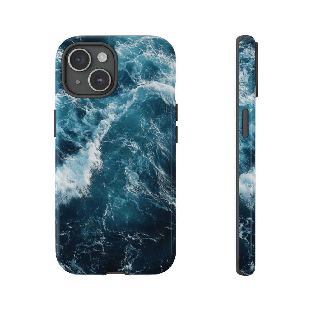 Dit ontwerp toont een close-up van oceaangolven in verschillende tinten diepblauw. De afbeelding vangt de dynamische beweging van het water met witte schuimkoppen en kolkende patronen, wat zorgt voor een gevoel van energie en natuurlijke schoonheid. Het hoesje heeft een glanzende afwerking en bestaat uit een stevige polycarbonaat buitenkant met een TPU binnenzijde voor dubbele bescherming. Het hoesje ondersteunt draadloos opladen en is bestand tegen weersinvloeden, waardoor de optische kwaliteit langdurig behouden blijft.