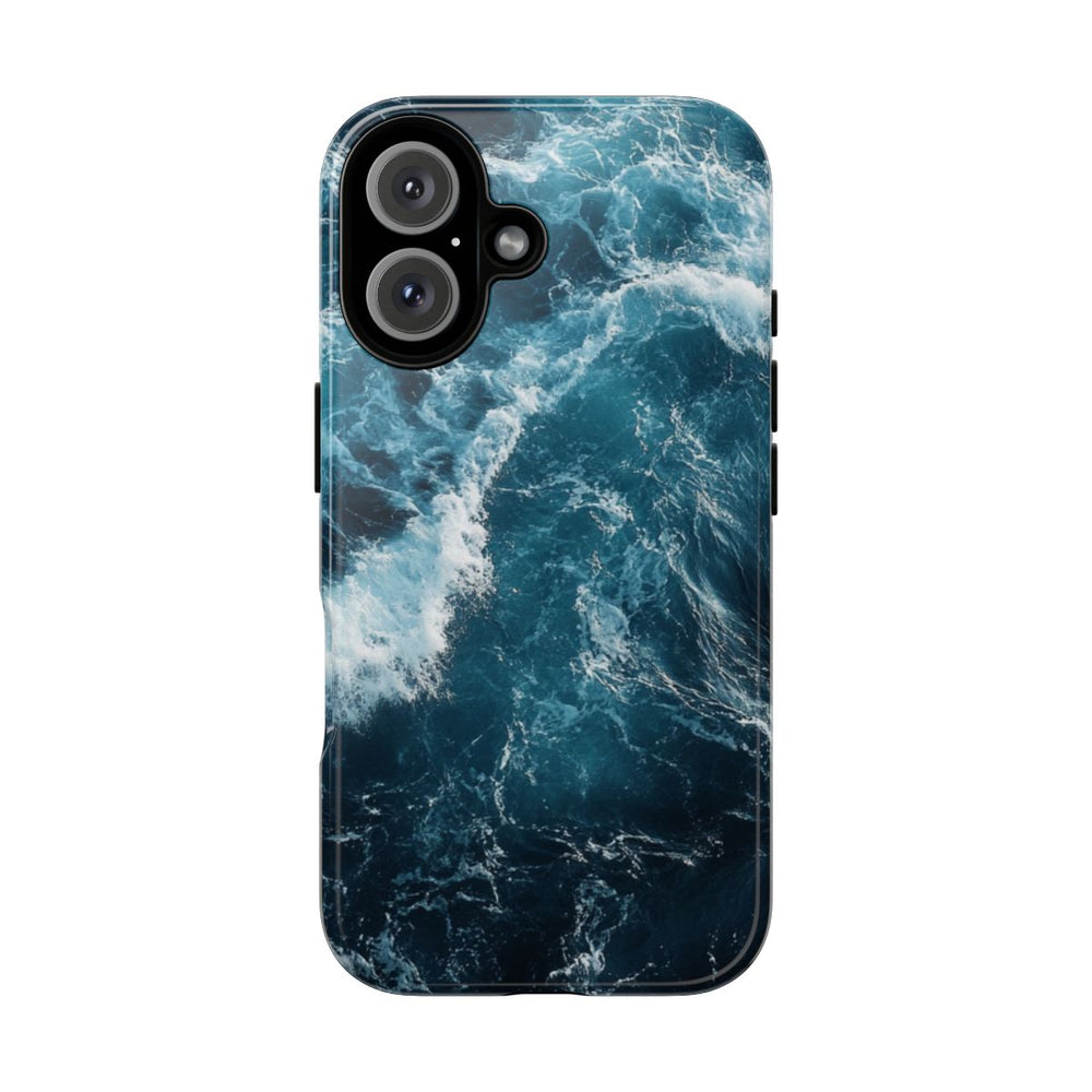 Dit ontwerp toont een close-up van oceaangolven in verschillende tinten diepblauw. De afbeelding vangt de dynamische beweging van het water met witte schuimkoppen en kolkende patronen, wat zorgt voor een gevoel van energie en natuurlijke schoonheid. Het hoesje heeft een glanzende afwerking en bestaat uit een stevige polycarbonaat buitenkant met een TPU binnenzijde voor dubbele bescherming. Het hoesje ondersteunt draadloos opladen en is bestand tegen weersinvloeden, waardoor de optische kwaliteit langdurig behouden blijft.