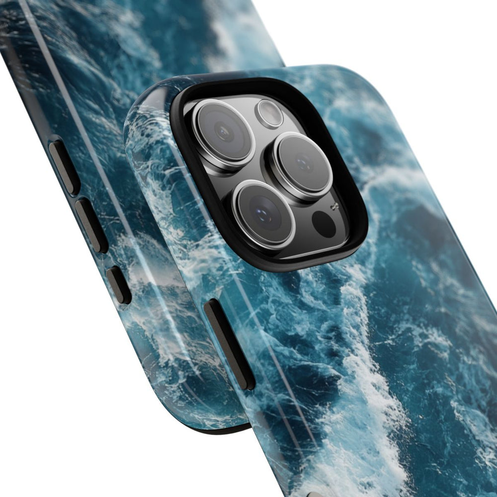 Dit ontwerp toont een close-up van oceaangolven in verschillende tinten diepblauw. De afbeelding vangt de dynamische beweging van het water met witte schuimkoppen en kolkende patronen, wat zorgt voor een gevoel van energie en natuurlijke schoonheid. Het hoesje heeft een glanzende afwerking en bestaat uit een stevige polycarbonaat buitenkant met een TPU binnenzijde voor dubbele bescherming. Het hoesje ondersteunt draadloos opladen en is bestand tegen weersinvloeden, waardoor de optische kwaliteit langdurig behouden blijft.