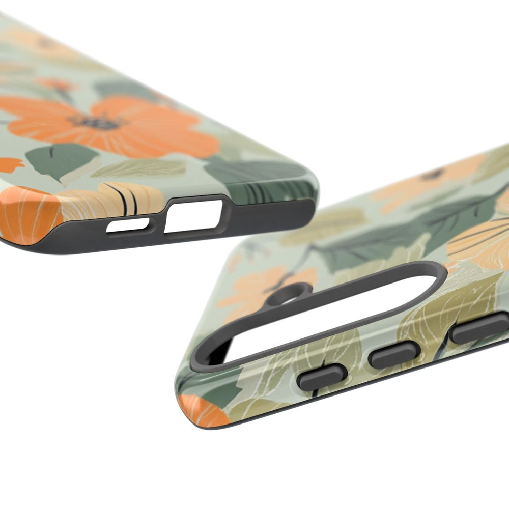 Dit telefoonhoesje heeft een naadloos bloemenpatroon met grote oranje en perzikkleurige bloemen, omringd door groene en beige bladeren op een zacht lichtgroene achtergrond. De bloemen hebben zwarte harten en fijne lijndetails, wat zorgt voor een handgetekende, artistieke uitstraling. Het patroon is gelijkmatig verdeeld en past perfect bij het glanzende, stevige hoesje. Dit product bestaat uit een dubbele laag met een polycarbonaat buitenkant en een TPU binnenzijde, wat zorgt voor extra stevigheid en ondersteuning voor draadloos opladen.
