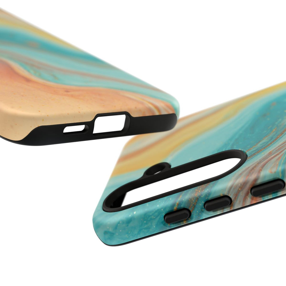 Dit hoesje heeft een verticale marmerstructuur met vloeiende patronen in oranje, teal en geel. De oppervlakte oogt glad en sierlijk, met subtiele glinsteraccenten die over het geheel verspreid zijn. De kleuren lopen zacht in elkaar over en zorgen voor een glanzend, iriserend effect dat een frisse en speelse uitstraling geeft. De print is aangebracht op een mat, stevig telefoonhoesje met een polycarbonaat buitenkant en een TPU-binnenzijde. Dankzij deze dubbele laag is je toestel extra goed beschermd en blijft draadloos opladen mogelijk.