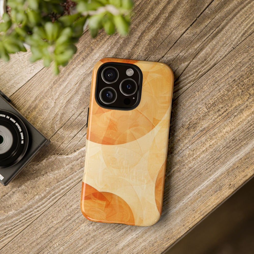 Dit ontwerp toont meerdere overlappende cirkels met ruwe randen in diverse oranje tinten. De cirkels zweven op een lichtbruine, getextureerde achtergrond en vormen zo een gelaagd en abstract geometrisch patroon. De afbeelding is bedrukt op een glanzend, stevig hoesje met een dubbele laag van polycarbonaat en TPU, wat zorgt voor extra stevigheid en bescherming. Het hoesje ondersteunt draadloos opladen en is bestand tegen invloeden van buitenaf.