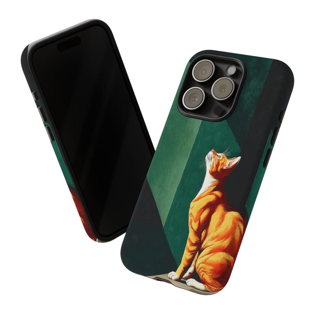 Dit hoesje toont een oranje kat die op een rand zit en omhoog kijkt. De achtergrond bestaat uit een geometrisch patroon van donkergroene en zwarte schaduwen, waardoor de vacht van de kat extra opvalt. Links is een kustplaats te zien met rode daken, water en bergen onder een blauwe lucht met een grote oranje zon. Het hoesje heeft een dubbele laag met een polycarbonaat buitenkant en een TPU-voering, en ondersteunt draadloos opladen.