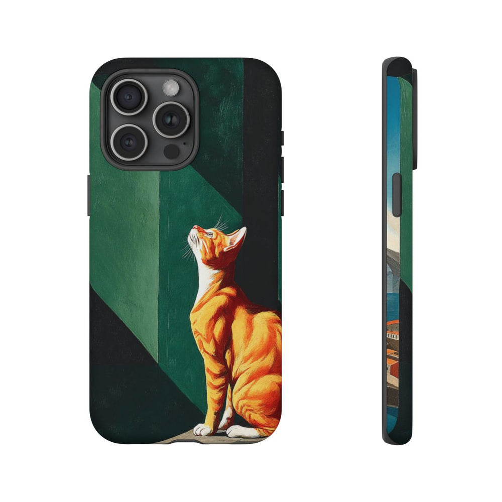 Dit ontwerp toont een oranje gestreepte kat die op een richel zit en omhoog kijkt. Op de achtergrond zijn donkergroene, geometrische architectonische vormen te zien die schaduwen werpen, met links een heldere blauwe lucht en een oranje zon. Onder de lucht ligt een kustplaats met roodgedekte gebouwen en kalm water. Het hoesje is mat afgewerkt, stevig en bestaat uit twee lagen: een polycarbonaat buitenkant en een TPU binnenzijde. Ondersteunt draadloos opladen.