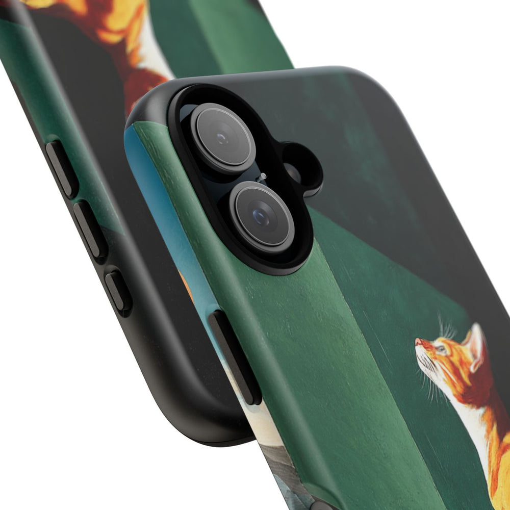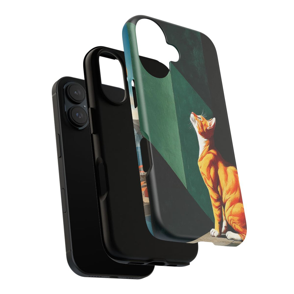 Dit ontwerp toont een oranje kat met witte pootjes die op een richel zit en omhoog kijkt. Op de achtergrond zijn donkergroene geometrische architectonische vormen te zien die schaduwen werpen. Links bevindt zich een feloranje zon in een blauwe lucht met wolken, bergen en een kustdorp met roodgedekte huisjes aan het water. Het hoesje heeft een dubbele laag met een matte afwerking en is gemaakt van polycarbonaat en TPU. Geschikt voor draadloos opladen.