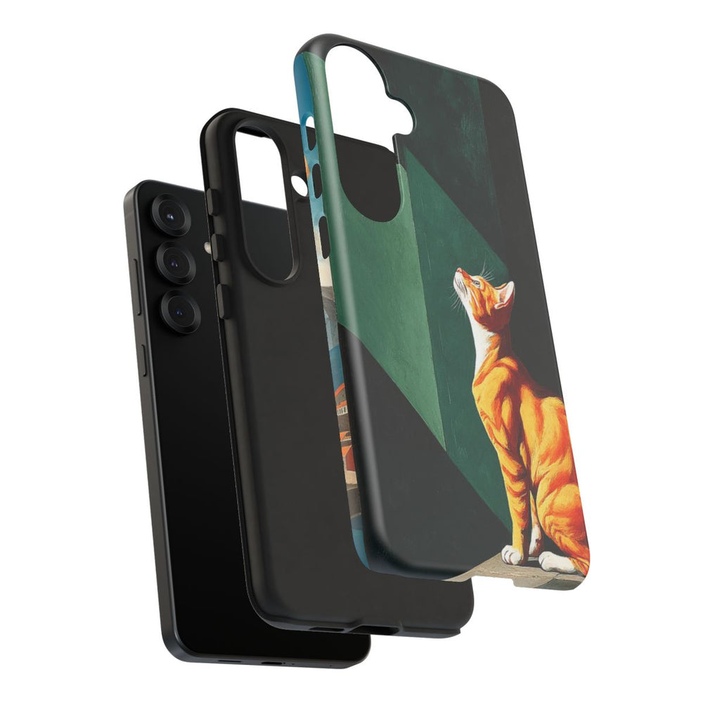 Dit ontwerp toont een oranje kat die zittend omhoog kijkt in een surrealistische, geometrische architecturale omgeving. Op de achtergrond zijn grote groene en zwarte hoekige vormen te zien die schaduwen werpen, met een feloranje zon en een kustplaatsje met roodgedekte huizen aan het water in de verte. Het hoesje is tweelaags met een polycarbonaat buitenkant en TPU-binnenvoering, en ondersteunt draadloos opladen.