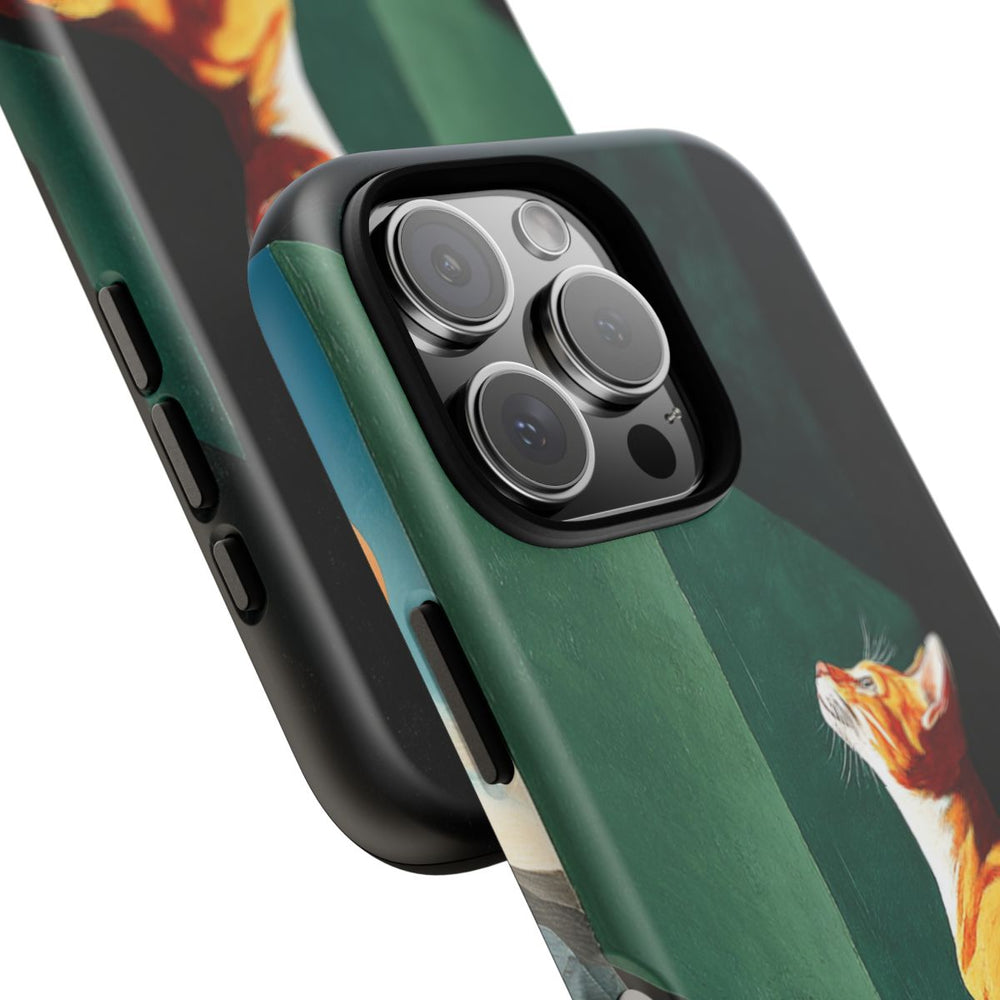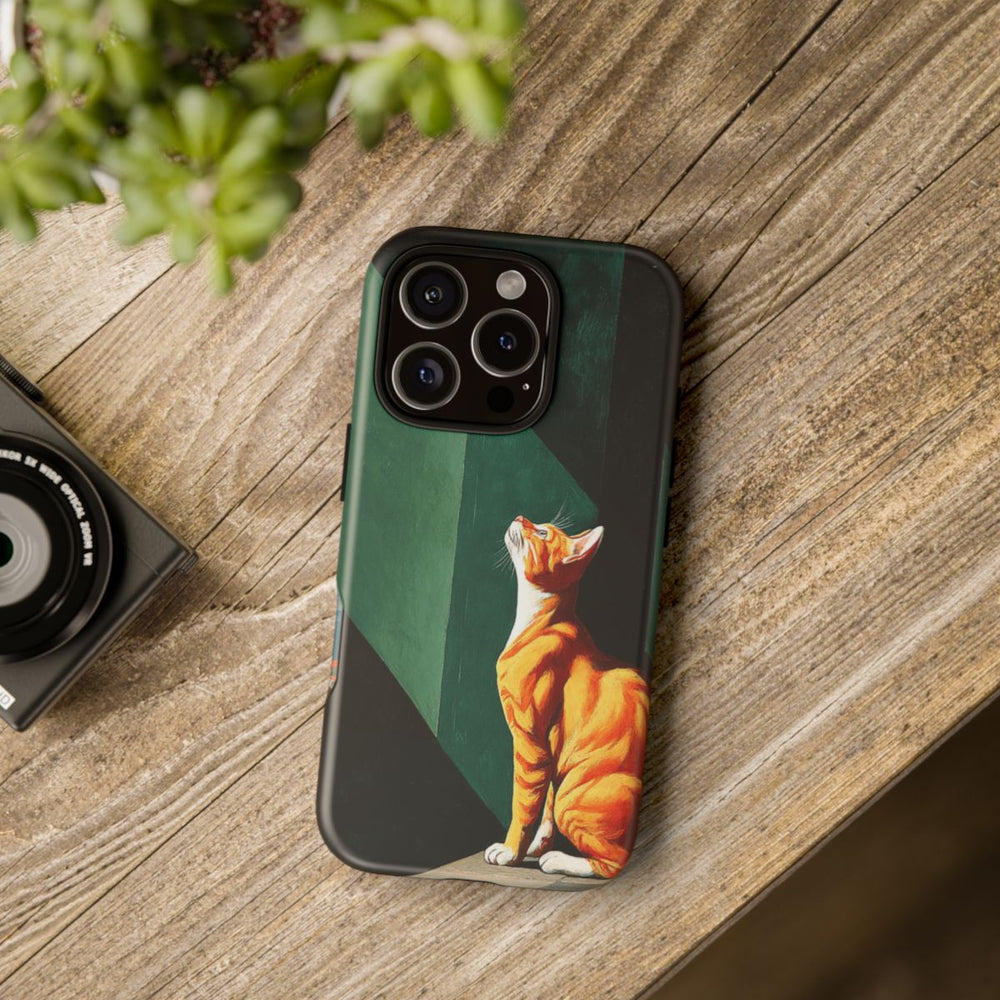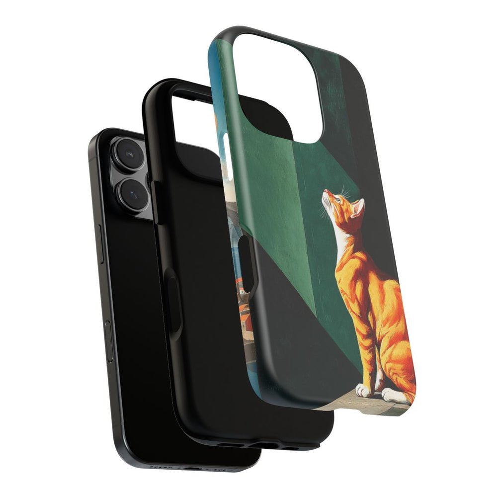 Dit ontwerp toont een feloranje kat die op een betegeld oppervlak zit en omhoog kijkt. Op de achtergrond zijn donkergroene geometrische vormen te zien die schaduwen werpen, met daarachter een heldere blauwe lucht en een oranje zon. In de verte ligt een kustplaatsje met roodgedekte huizen en bergen. Het hoesje bestaat uit twee lagen met een matte afwerking: een stevige polycarbonaat buitenkant en een TPU-binnenzijde. Ondersteunt draadloos opladen.