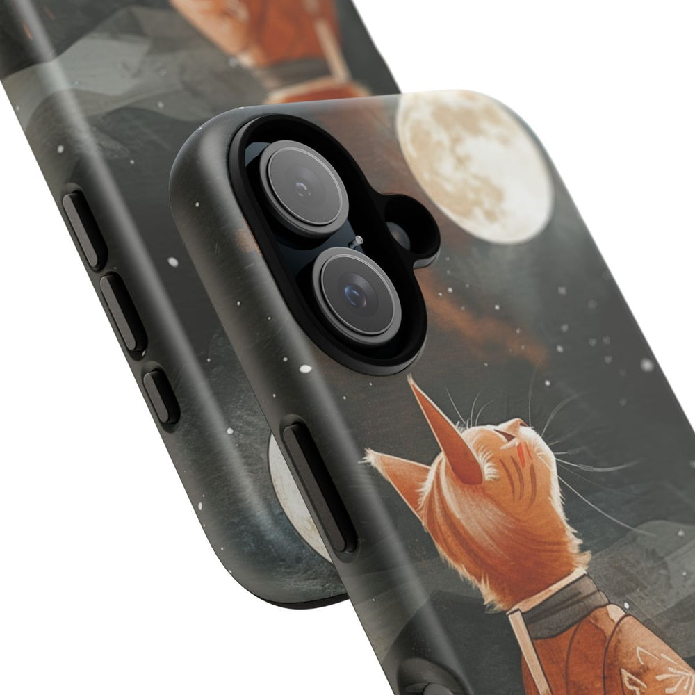Dit hoesje toont een oranje kat in een traditioneel gewaad met bloemen- en hartmotieven. De kat kijkt op naar een grote volle maan aan een donkere, heldere sterrenhemel. Op de achtergrond zie je een houten vloer en een vensterkozijn, met daarachter bergen en kale bomen in de verte. Het kunstwerk is uitgevoerd in zachte, gedempte kleuren met veel oog voor detail. Het hoesje bestaat uit twee lagen van polycarbonaat en TPU en ondersteunt draadloos opladen.